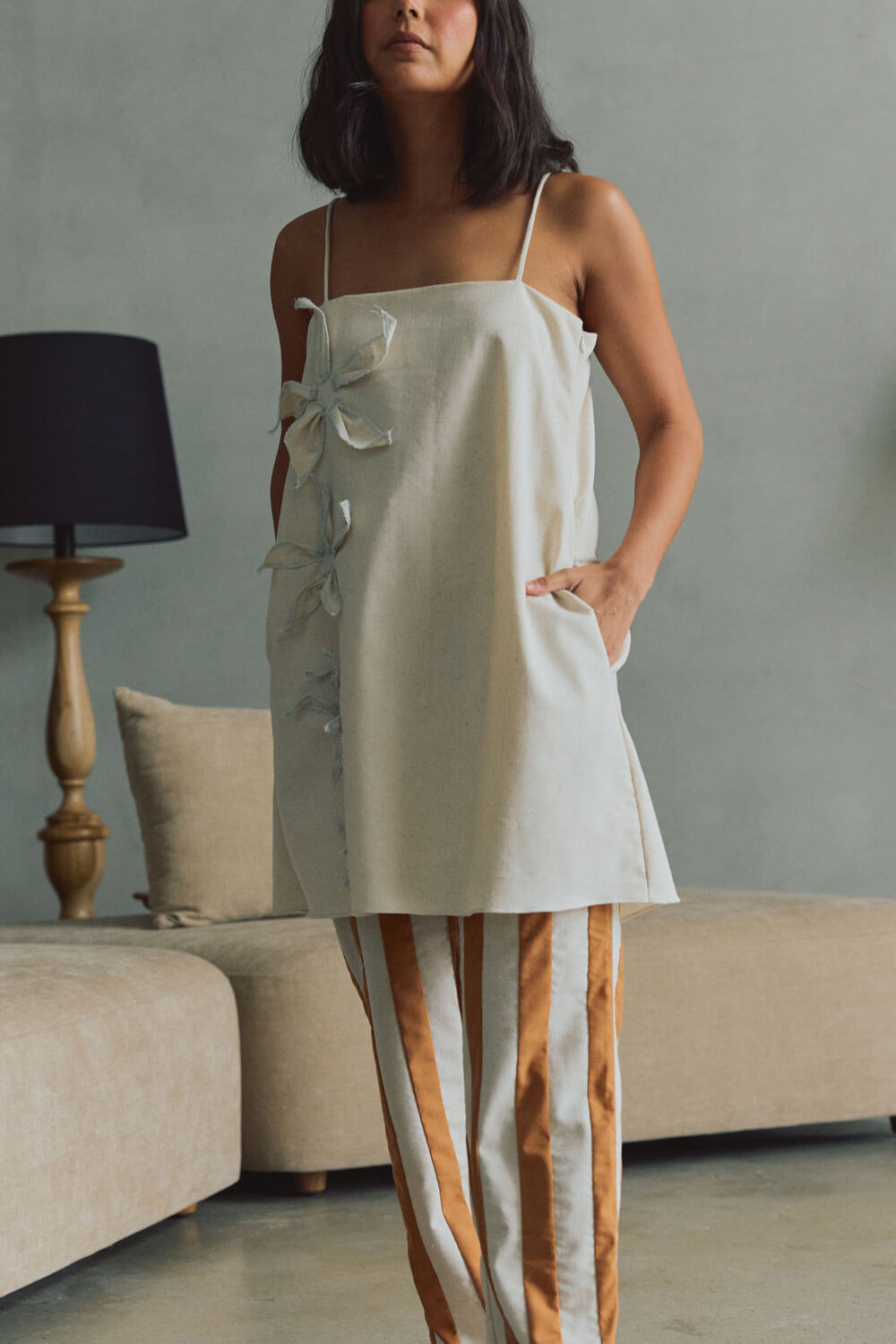 True to size. Spaghetti strap A-line silhouette mini dress with pockets. Wear the floral detail in the front or back. Florals were designed to have an artfully wilted look. Petals have contrast topstitching detail.