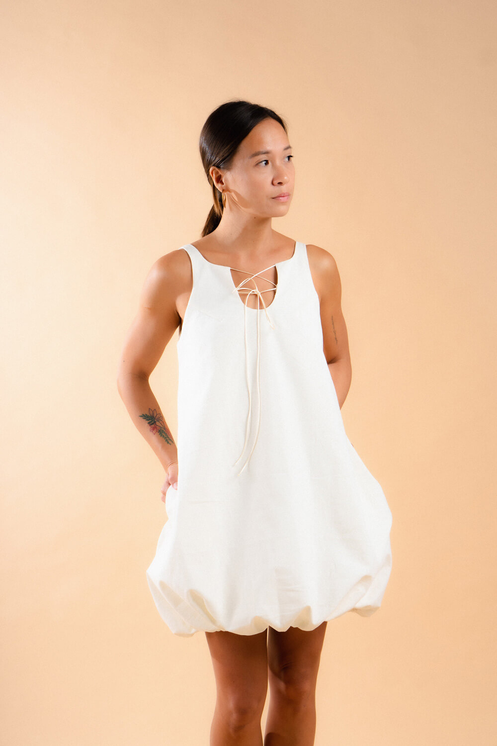 True to size. Bubble hem mini dress with pockets. Reversible, multi-style neckline. Strap detail can be worn front or back. Double lined in cotton linen.