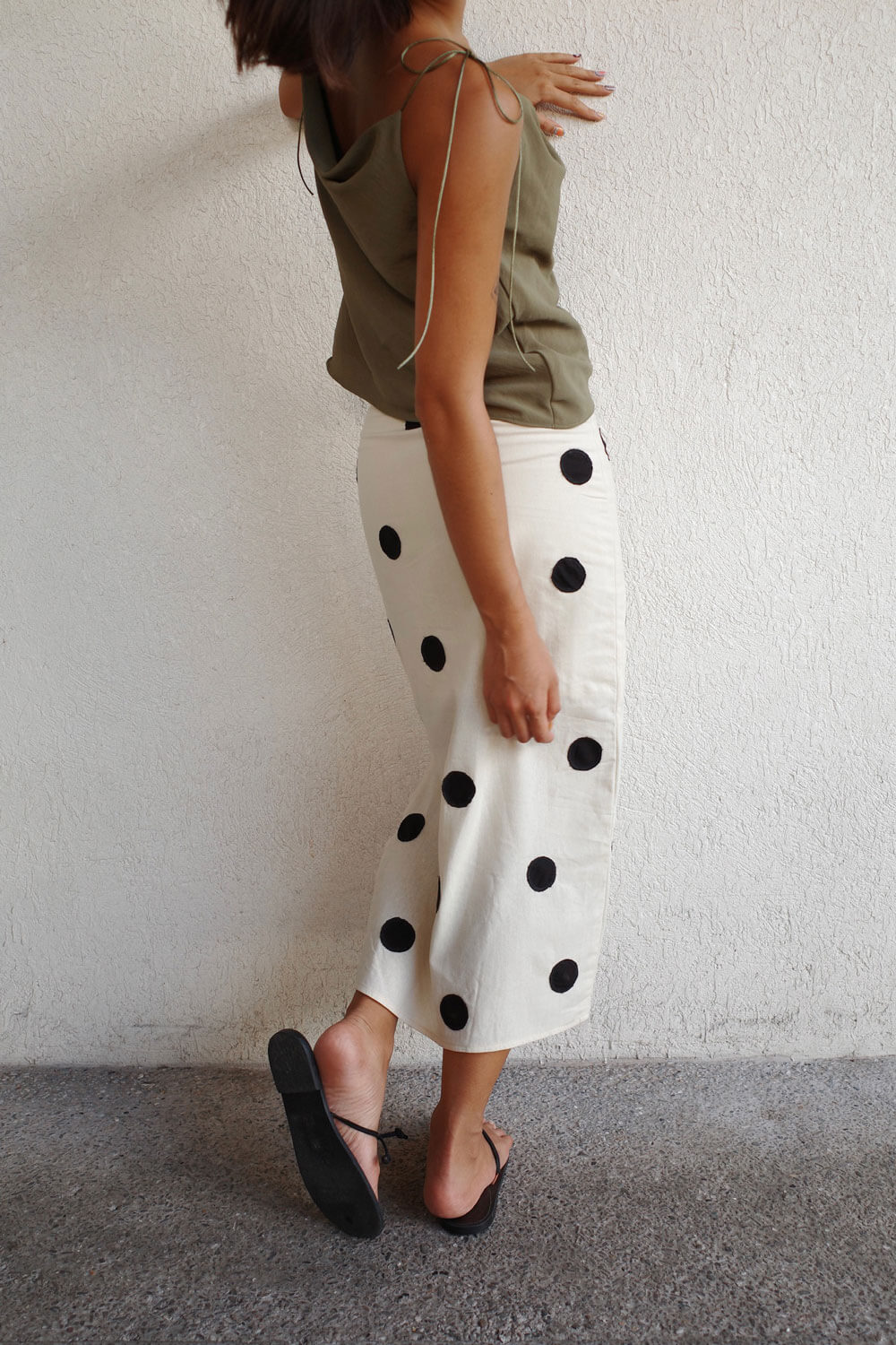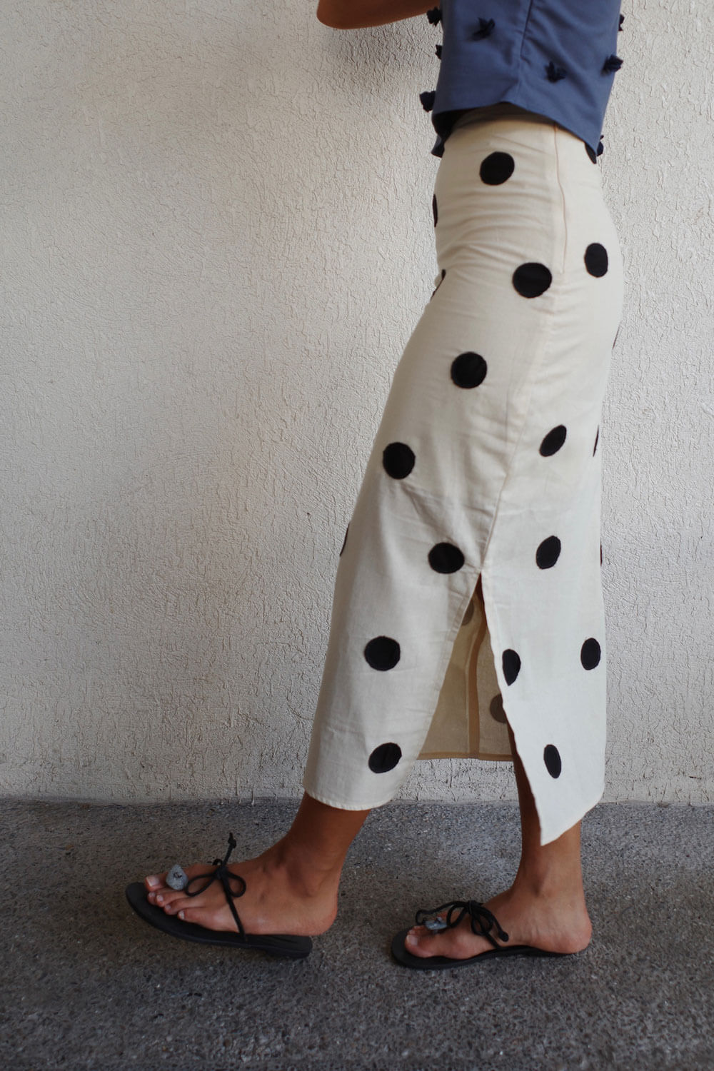True to size. High waist, tapered silhouette, maxi length skirt with side slit & invisible zipper closure. Polka dots are hand-cut and hand-sewn individually. No pockets.