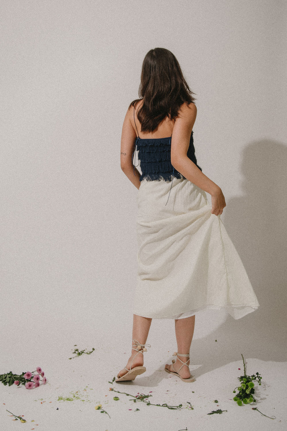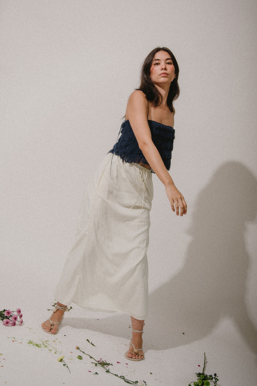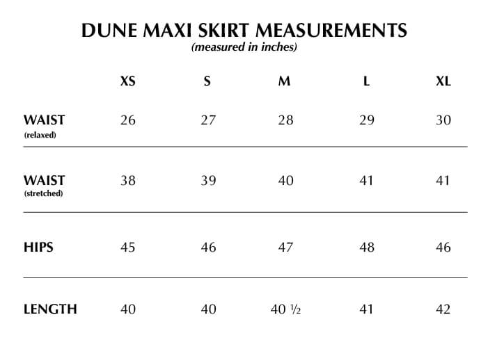 True to size. Shirred maxi skirt with pockets. Length is customizable to your liking. Garterized waist with satin cord drawstring. Can be worn high or low waist.
