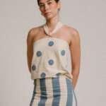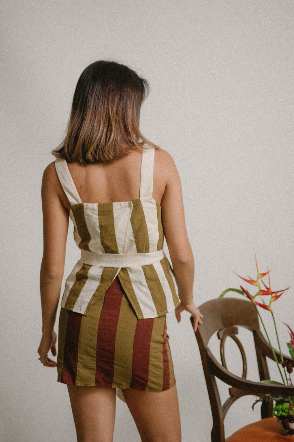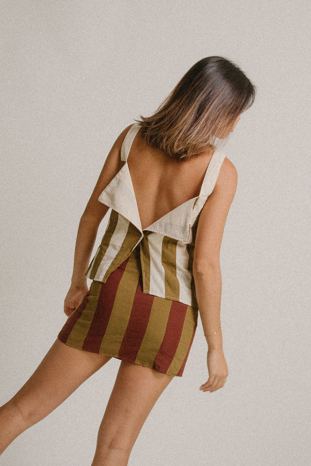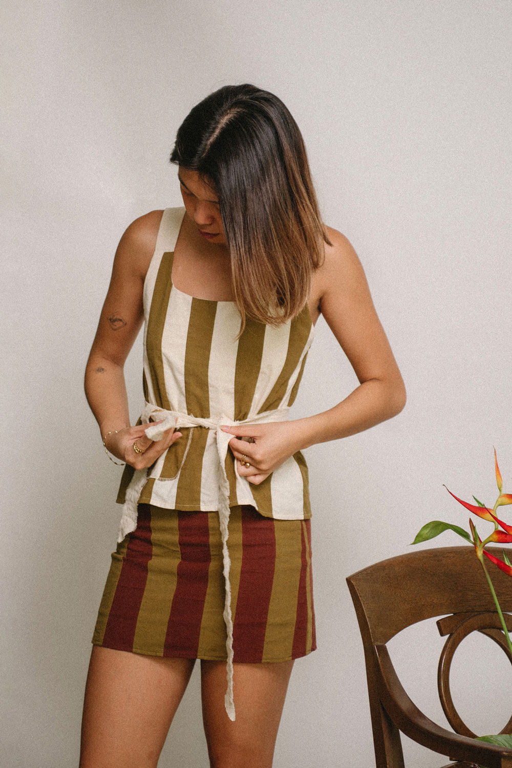 True to size. High waist, shift silhouette mini skirt with invisible side zipper opening and individually handcut and sewn stripes.