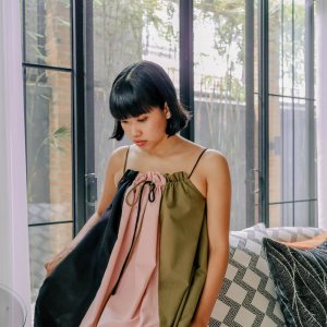Designed with a loose fit. XS & S have the same pattern; M & L have the same pattern. Ribbon detail can be worn front or back. With pockets. Neckline can be scrunched OR loosened to narrow OR widen the ruching detail. Strap length is adjustable via drawstring straps.