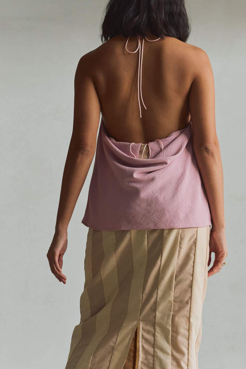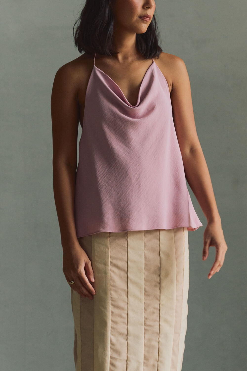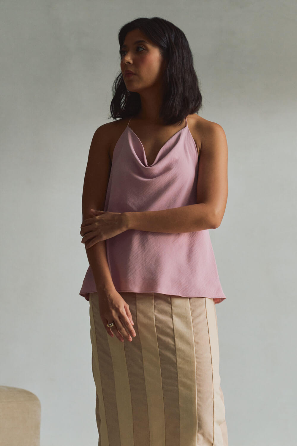 Designed with a loose fit. Multi-style cowl neck top. Style with shoulder ribbon ties, as a halter, or tie around the waist.