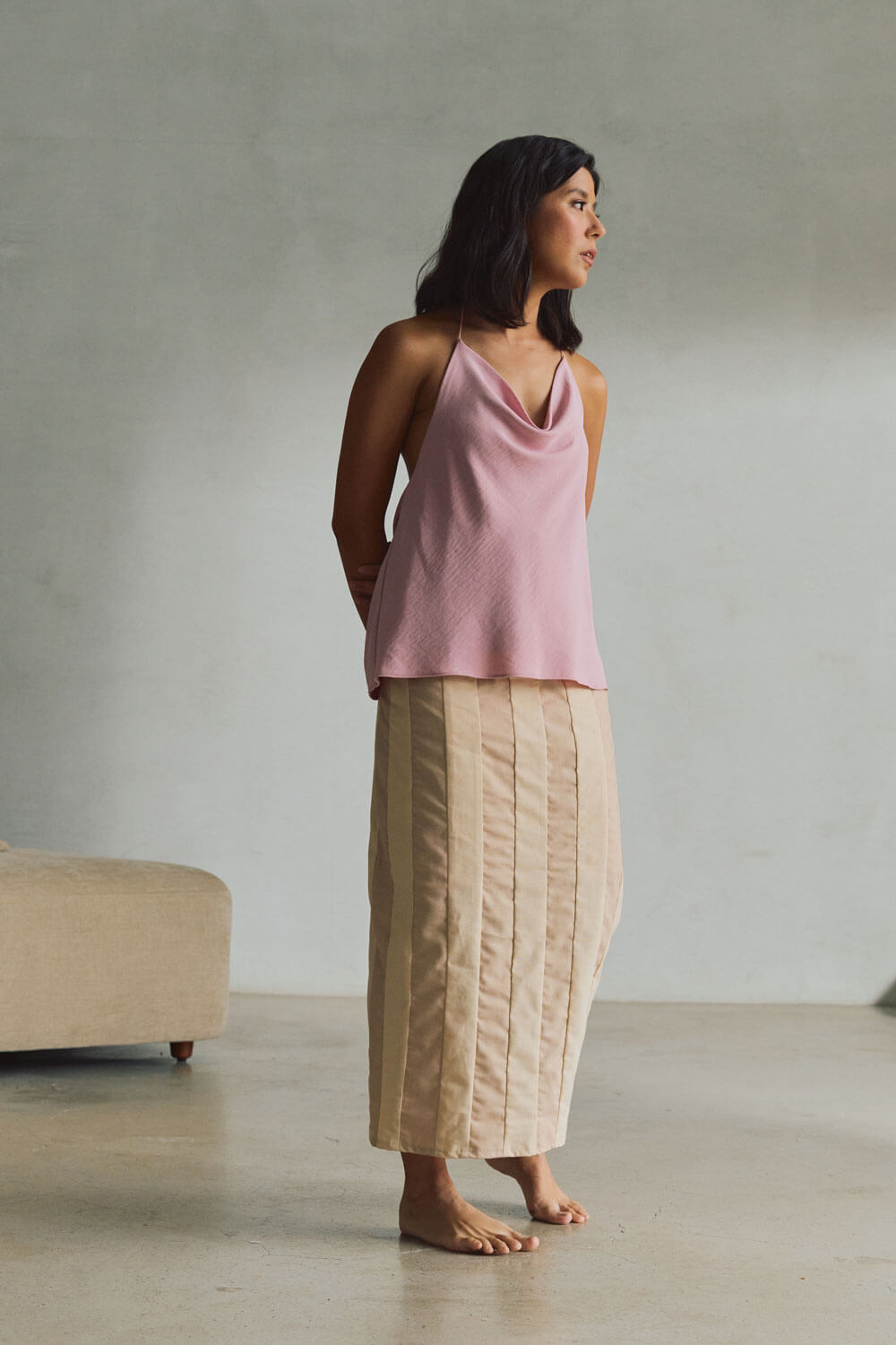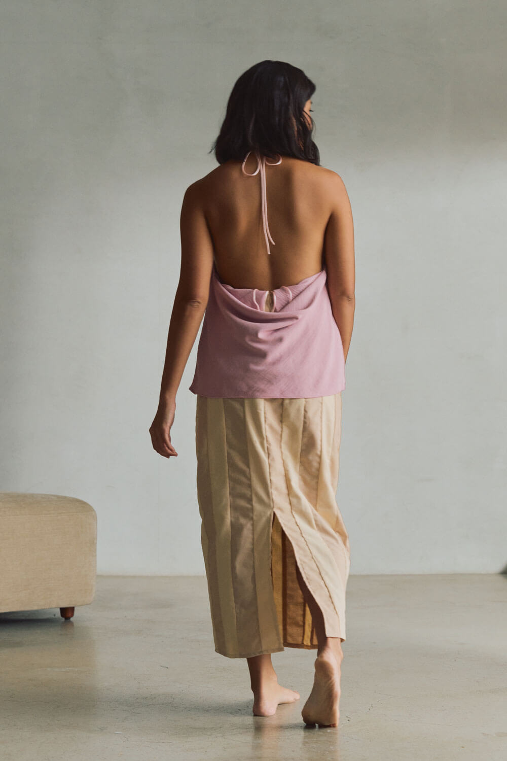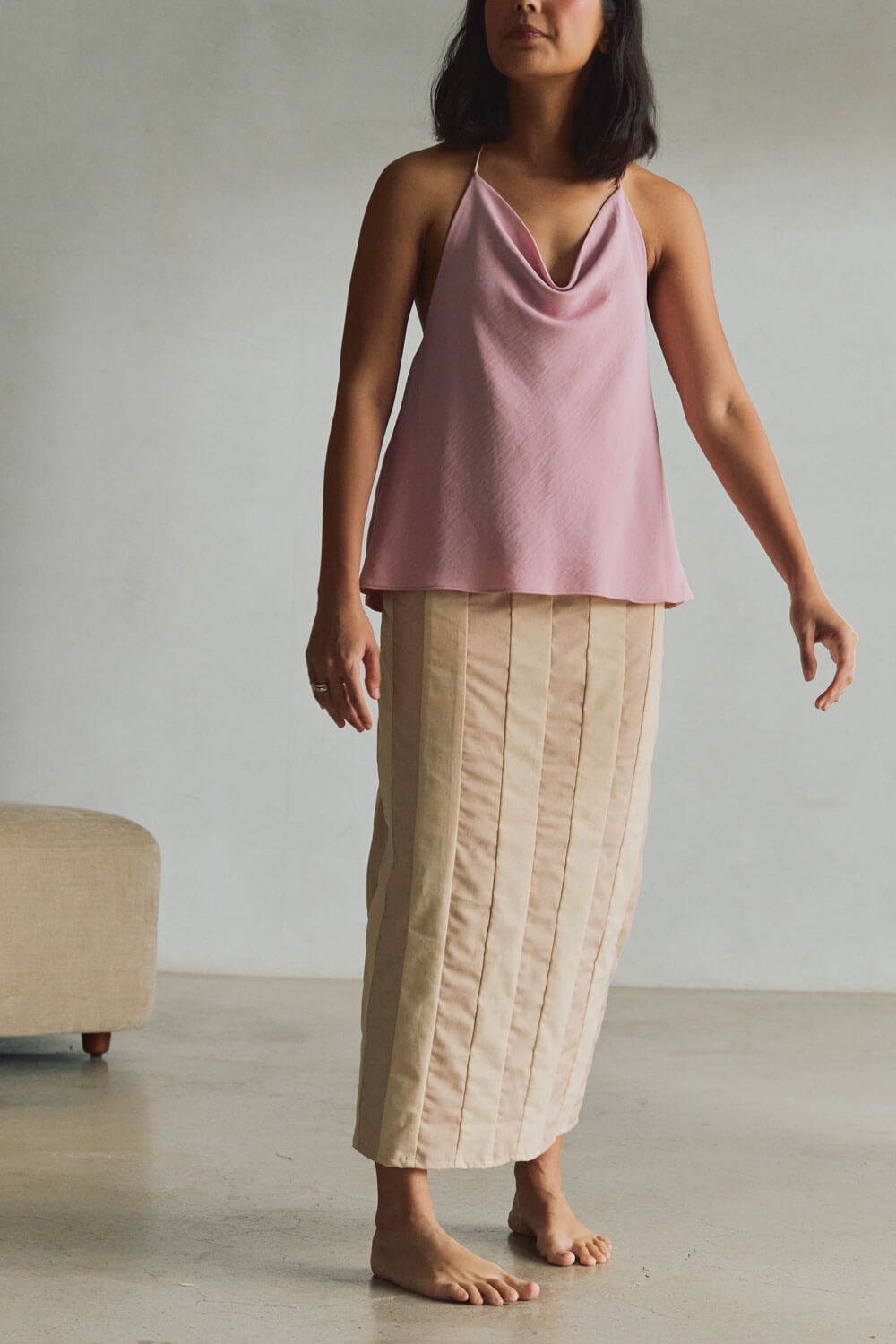 Designed with a loose fit. Multi-style cowl neck top. Style with shoulder ribbon ties, as a halter, or tie around the waist.