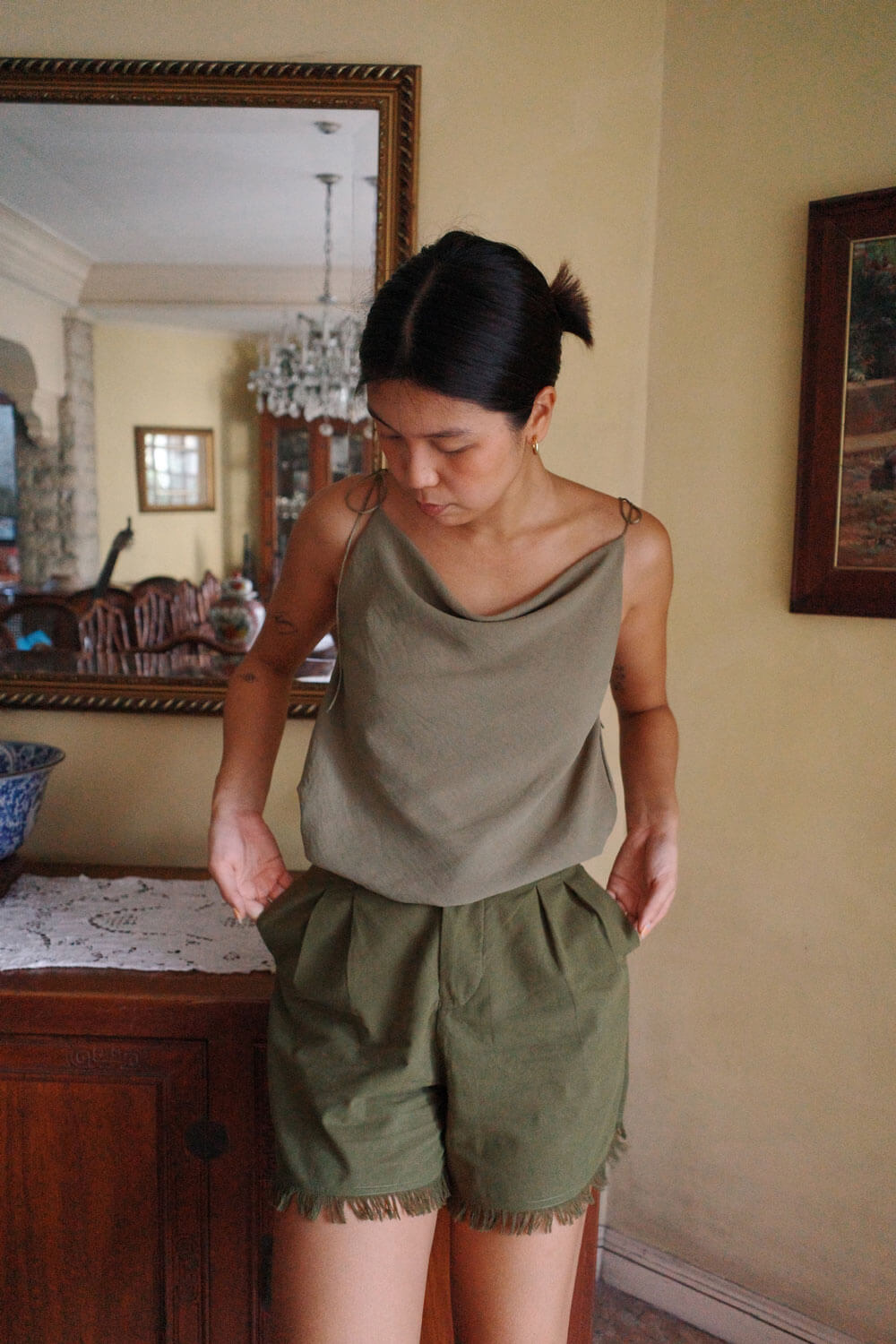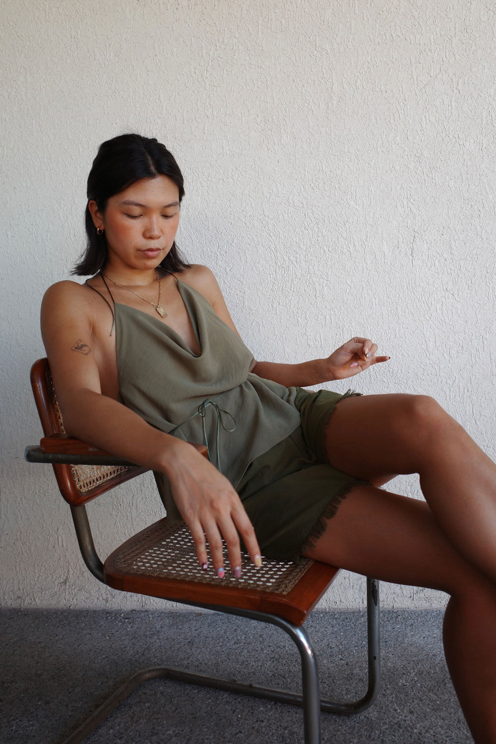 Designed with a loose fit. Multi-style cowl neck top. Style with shoulder ribbon ties, as a halter, or tie around the waist.