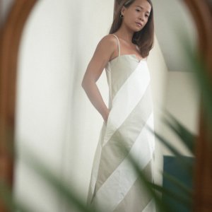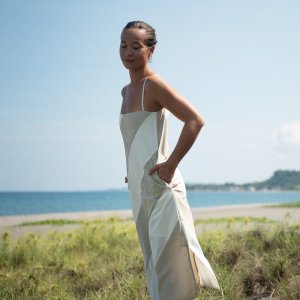 True to size. Reversible neckline, fitted shift silhouette with pockets. Panels are sewn together individually, double lined.