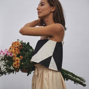 True to size. Cropped length, best paired with high waist bottoms. Reversible neckline (either side is front or back).