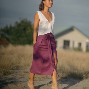 True to size; Wrap-around midi-length skirt, sits high waist. Tie in a bow or double knot to secure. Snap buttons to hold flap in place.