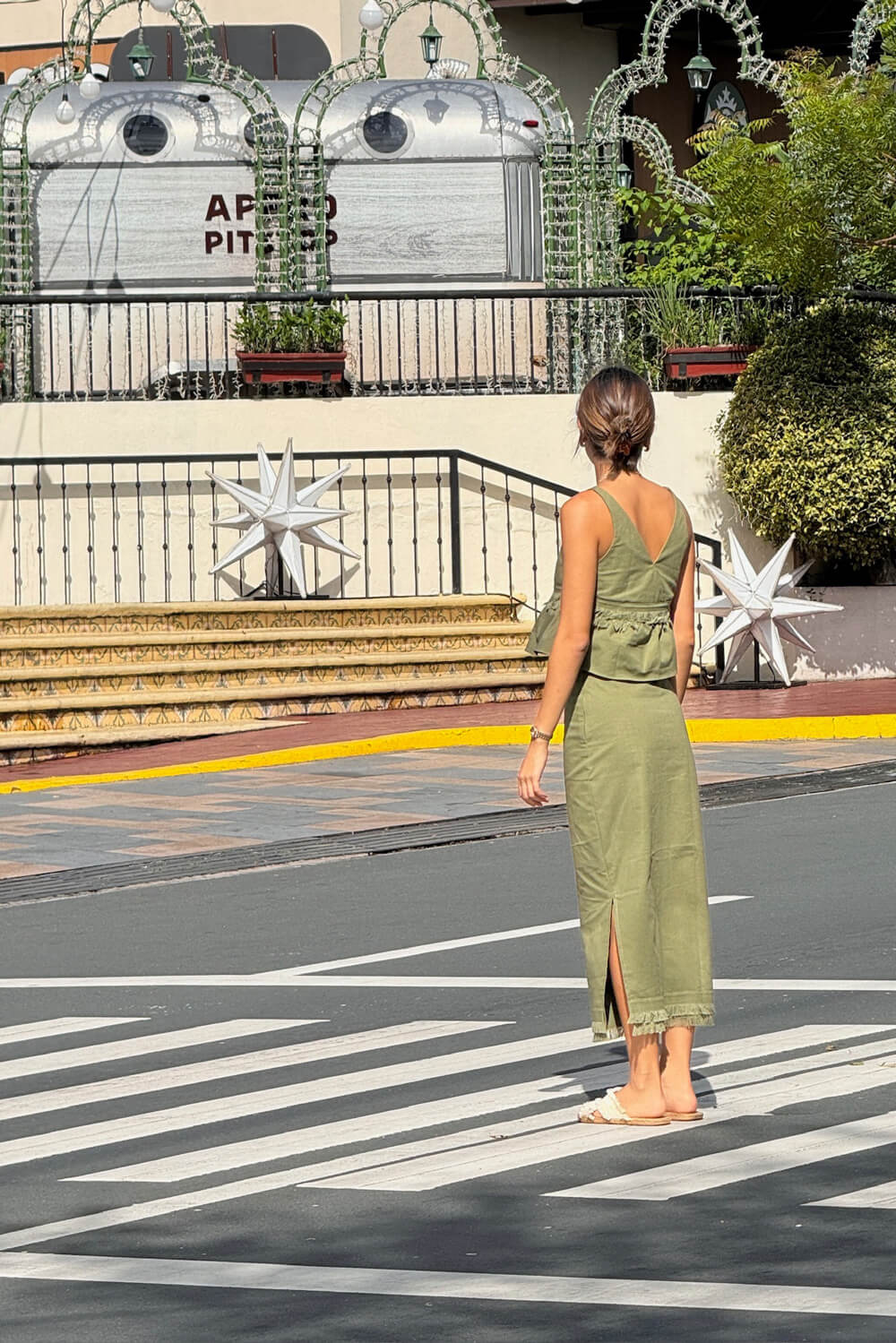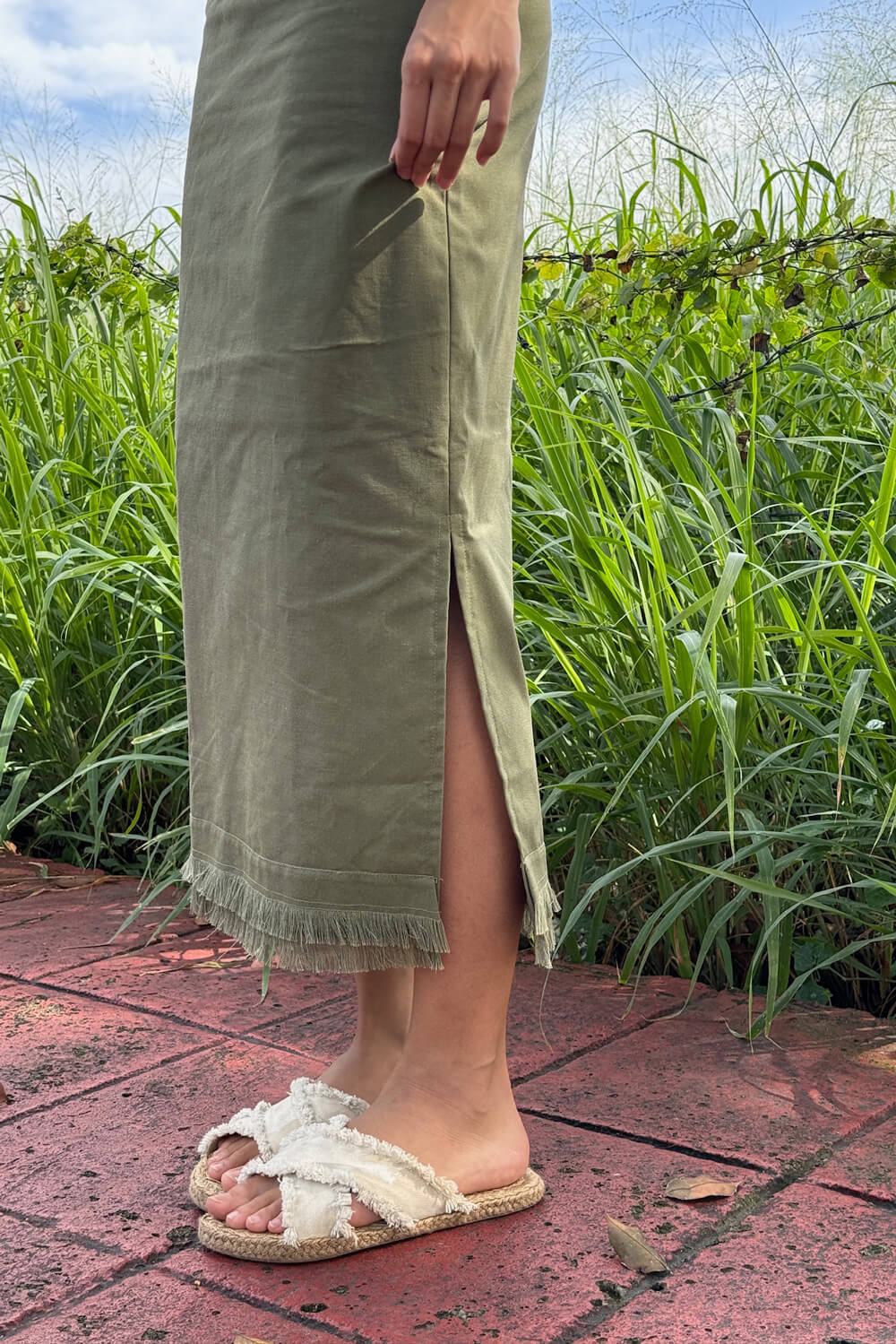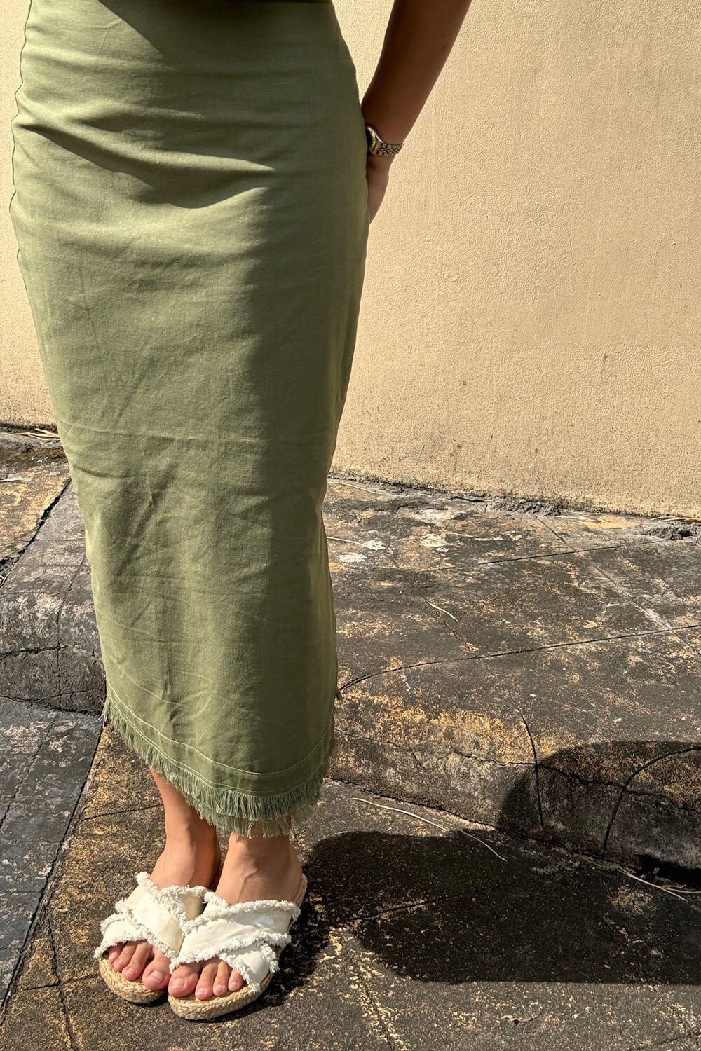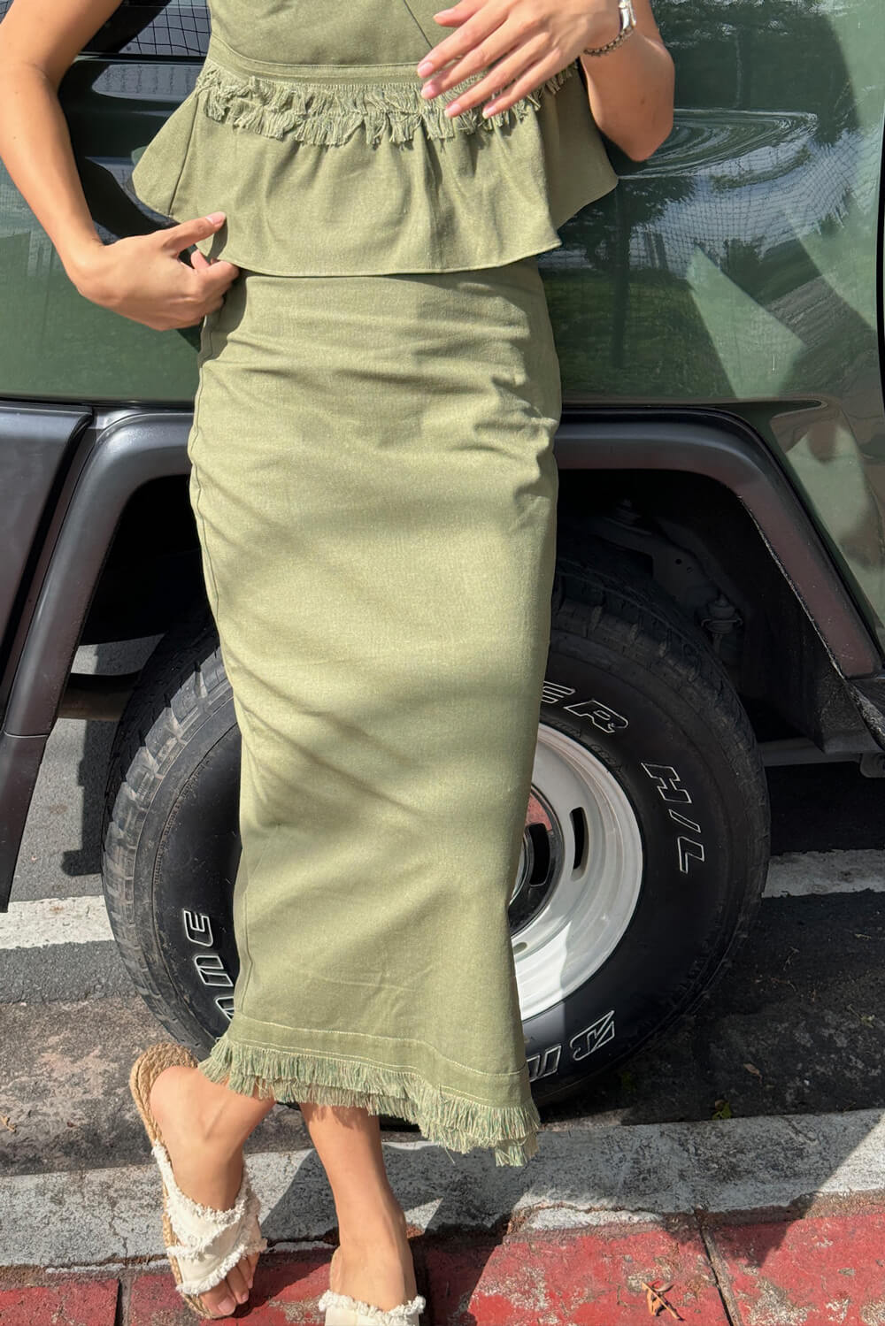 True to size. High waist, tapered silhouette, maxi length skirt with side slit & invisible zipper closure.