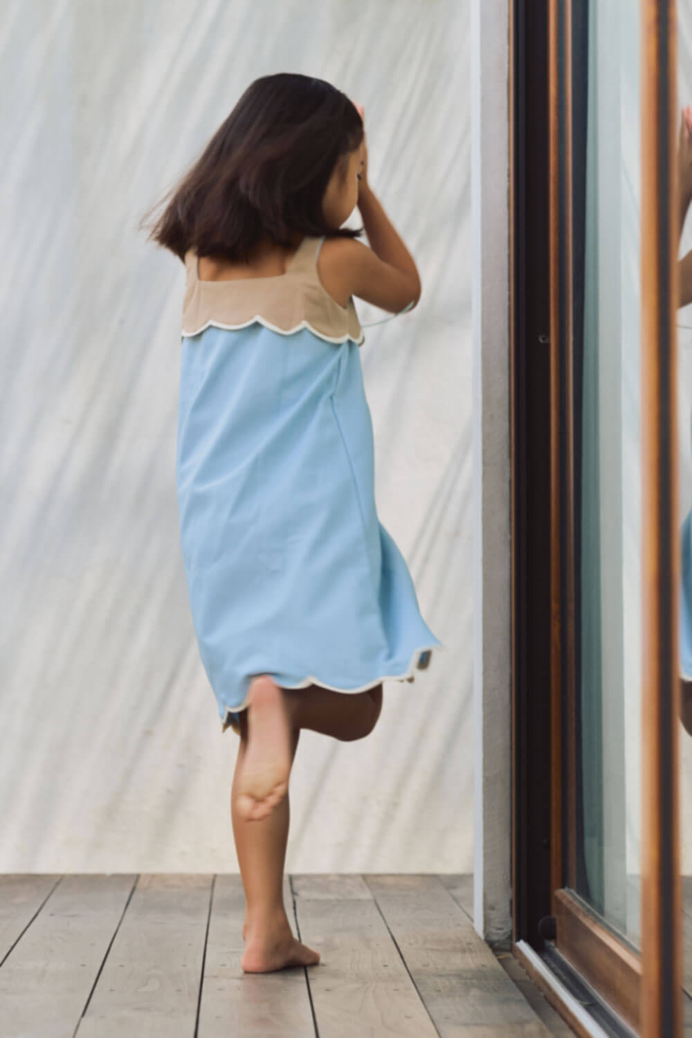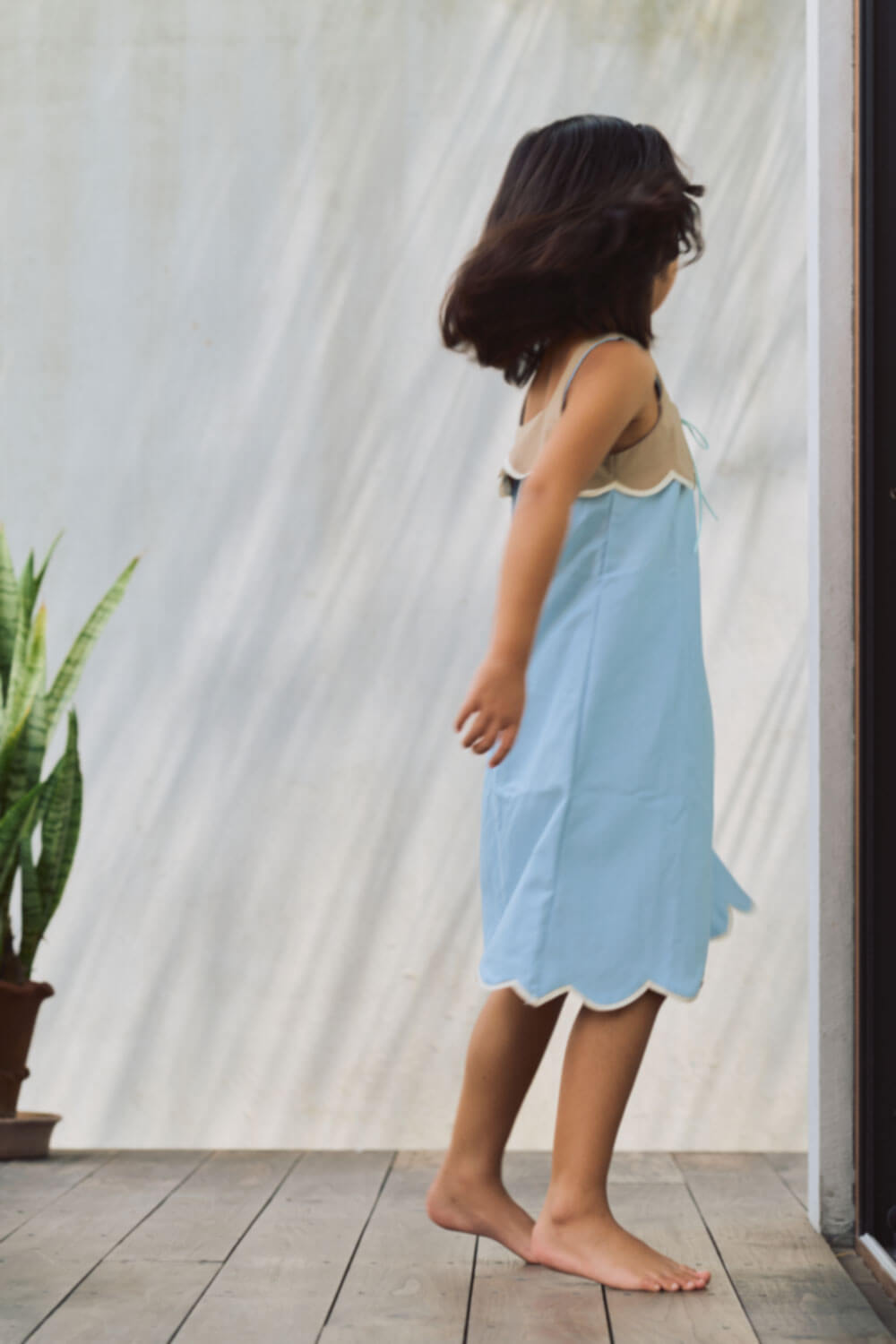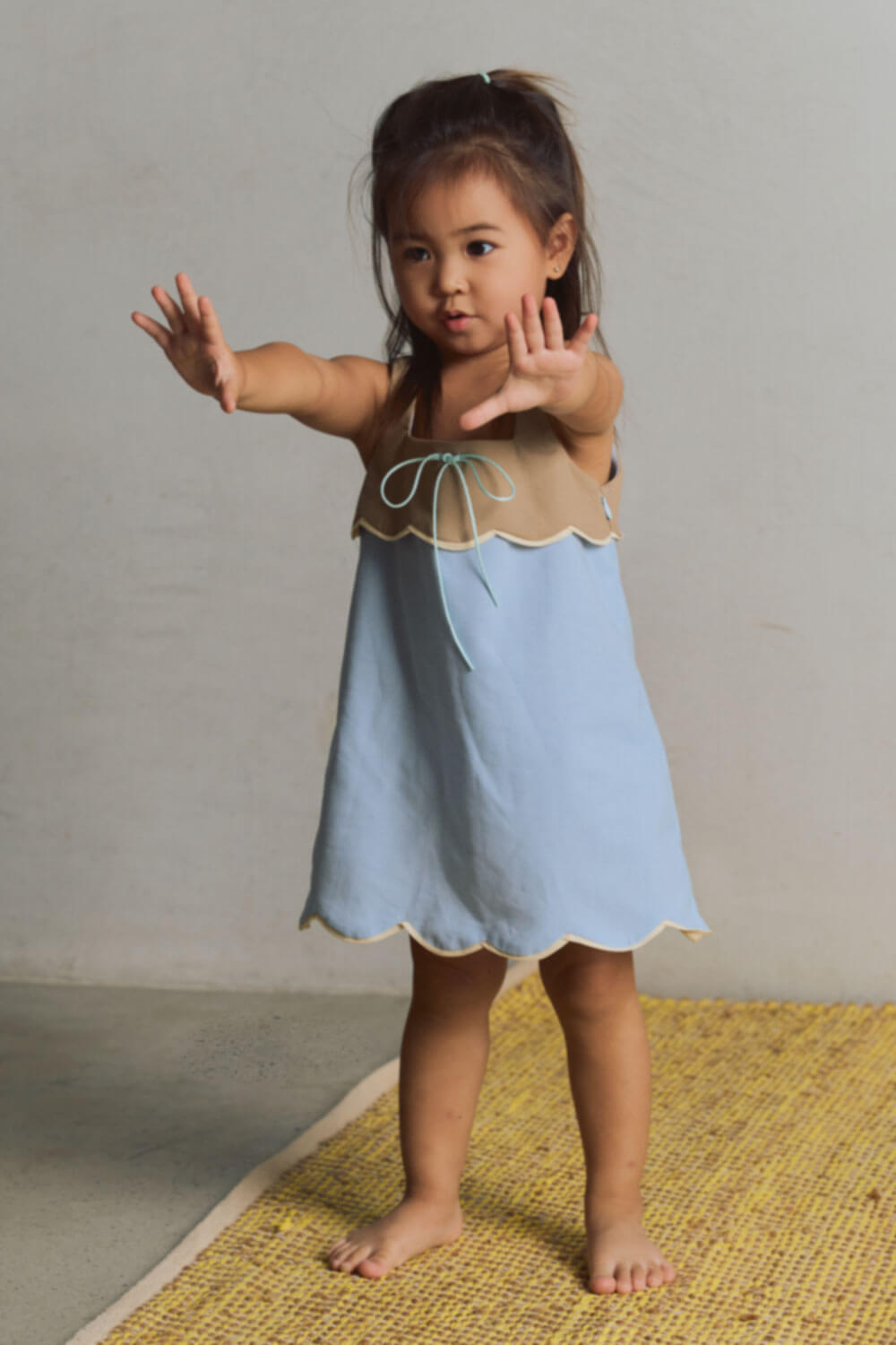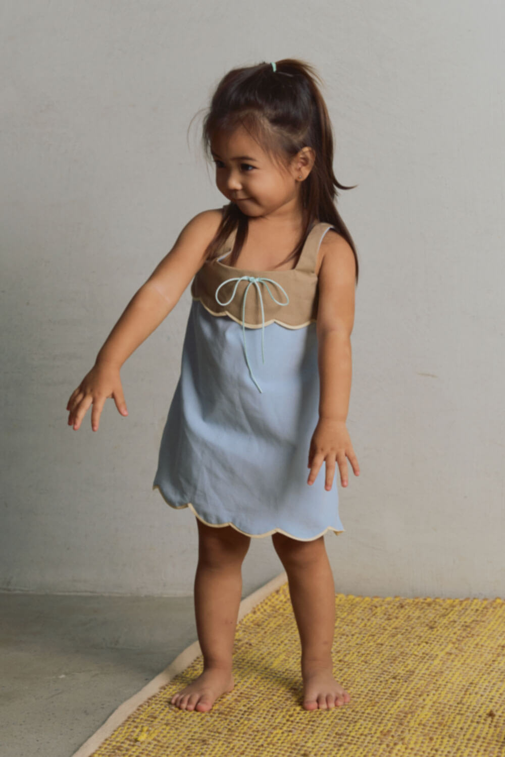 True to size. A-line silhouette dress with scallop detail on bib portion and hem.