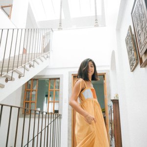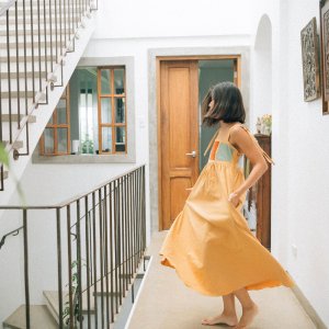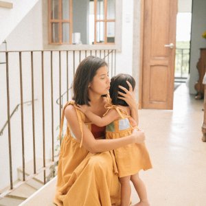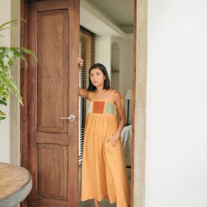 Designed with a loose fit. XS & S have the same pattern; M & L have the same pattern. Strap length can be adjusted via shoulder ribbon ties. Empire waist; with pockets.