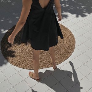 True to size around the bust; A-line trapeze silhouette designed for a loose, swingy fit. Strap length is adjustable. With pockets.