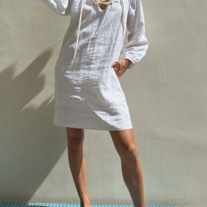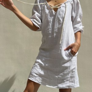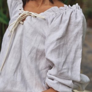 True to size. Puff sleeved with garterized wrists–wear sleeves long or pulled up to elbows. Wear on or off shoulder, adjusting tightness via drawstring detail. Drawstring detail can be worn front or back. Shift silhouette with pockets.