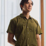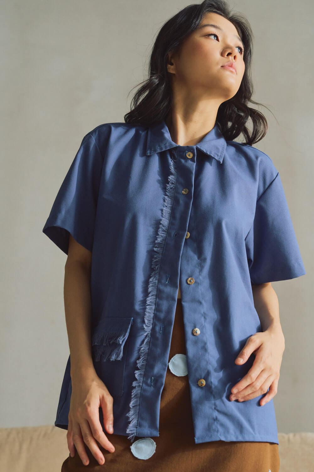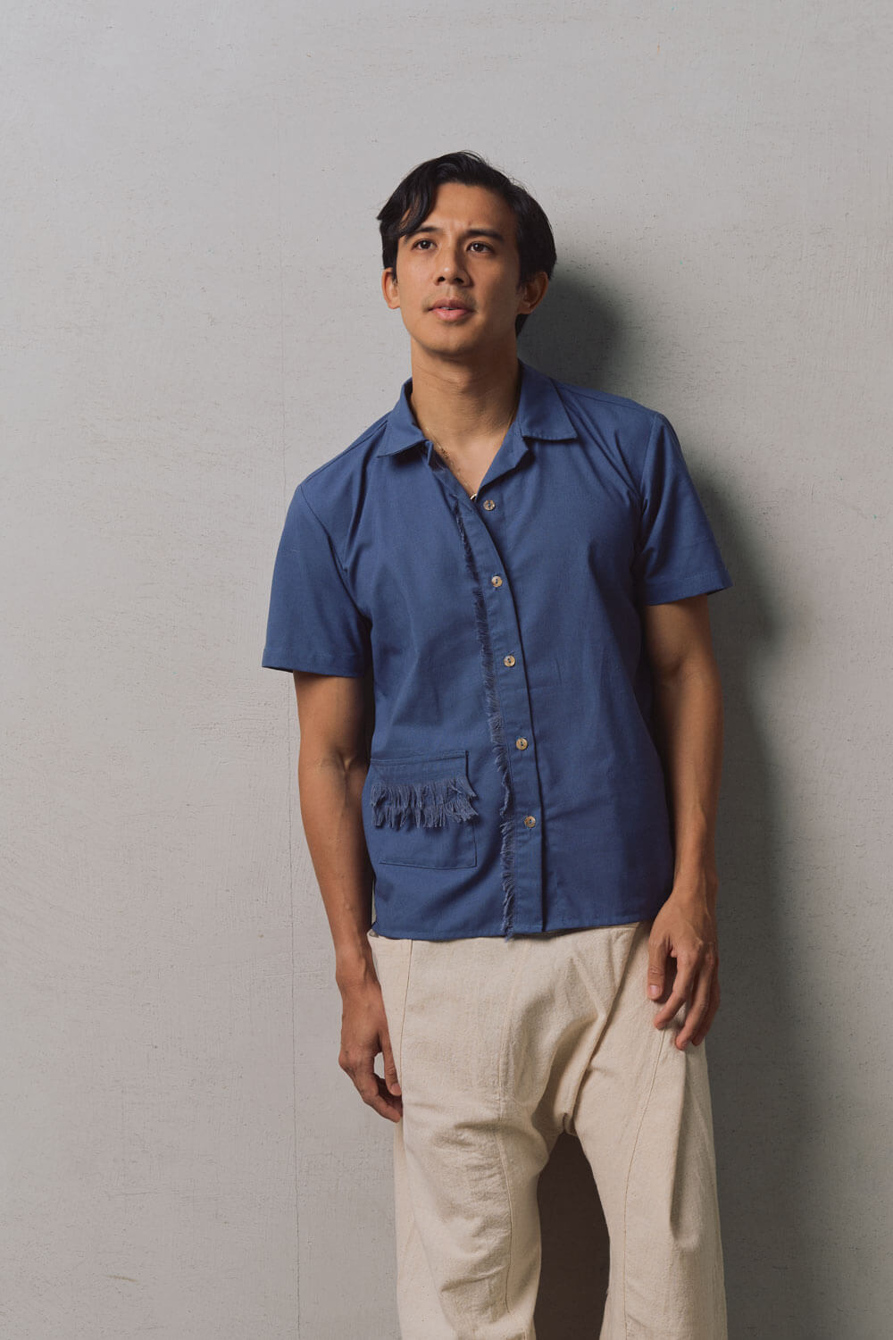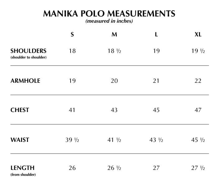 True to size. Size up if you prefer an oversized fit. Button down polo shirt designed for both men and women. Vertical fringe detail with a functional fringed flap pocket. Design detail is patterned after our bestselling women’s style, the Paloma fringe top. Capiz shell buttons are used.