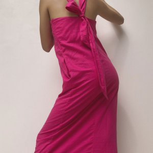 True to size; Halter midi dress with angled neckline, invisible side pockets, and straps that can be styled multiple ways (halter, X-back, V back, bowed, straight straps, etc.).