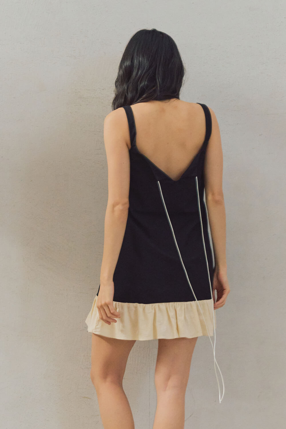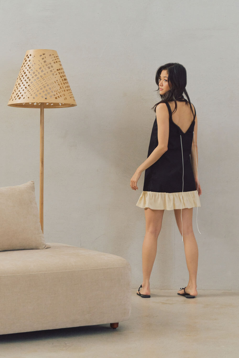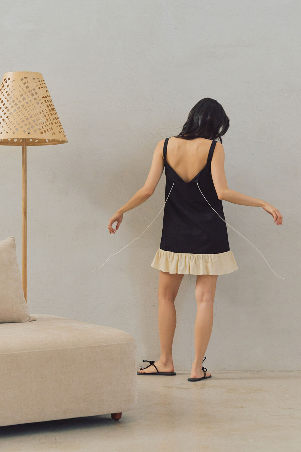 Designed with a loose fit. Mini dress length with pockets and keyhole detail on neckline. Neckline is reversible (either side can be worn in front). Wear the keyhole detail and ribbon tie in the front or back. Tie ribbon straps into a bow or leave untied.