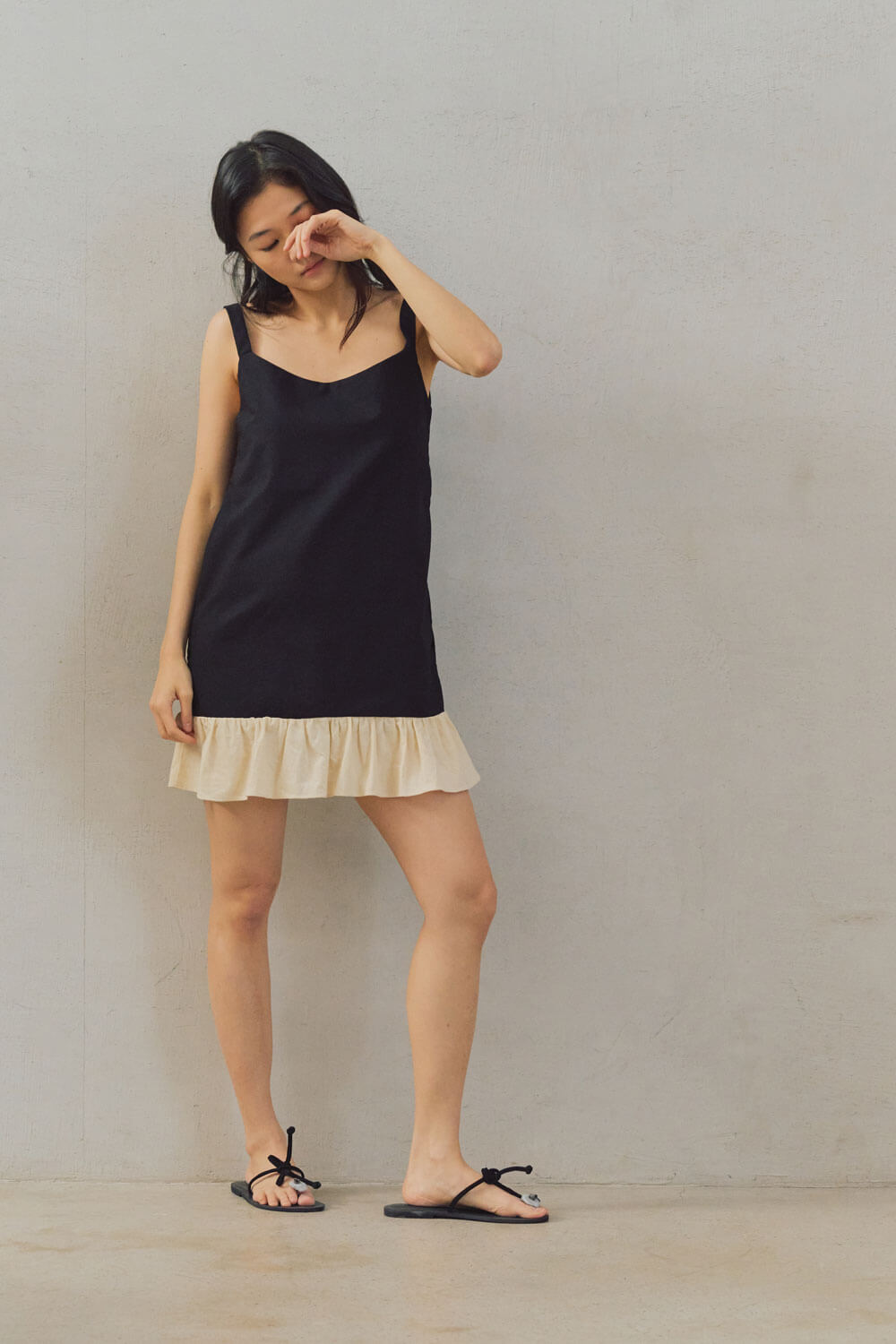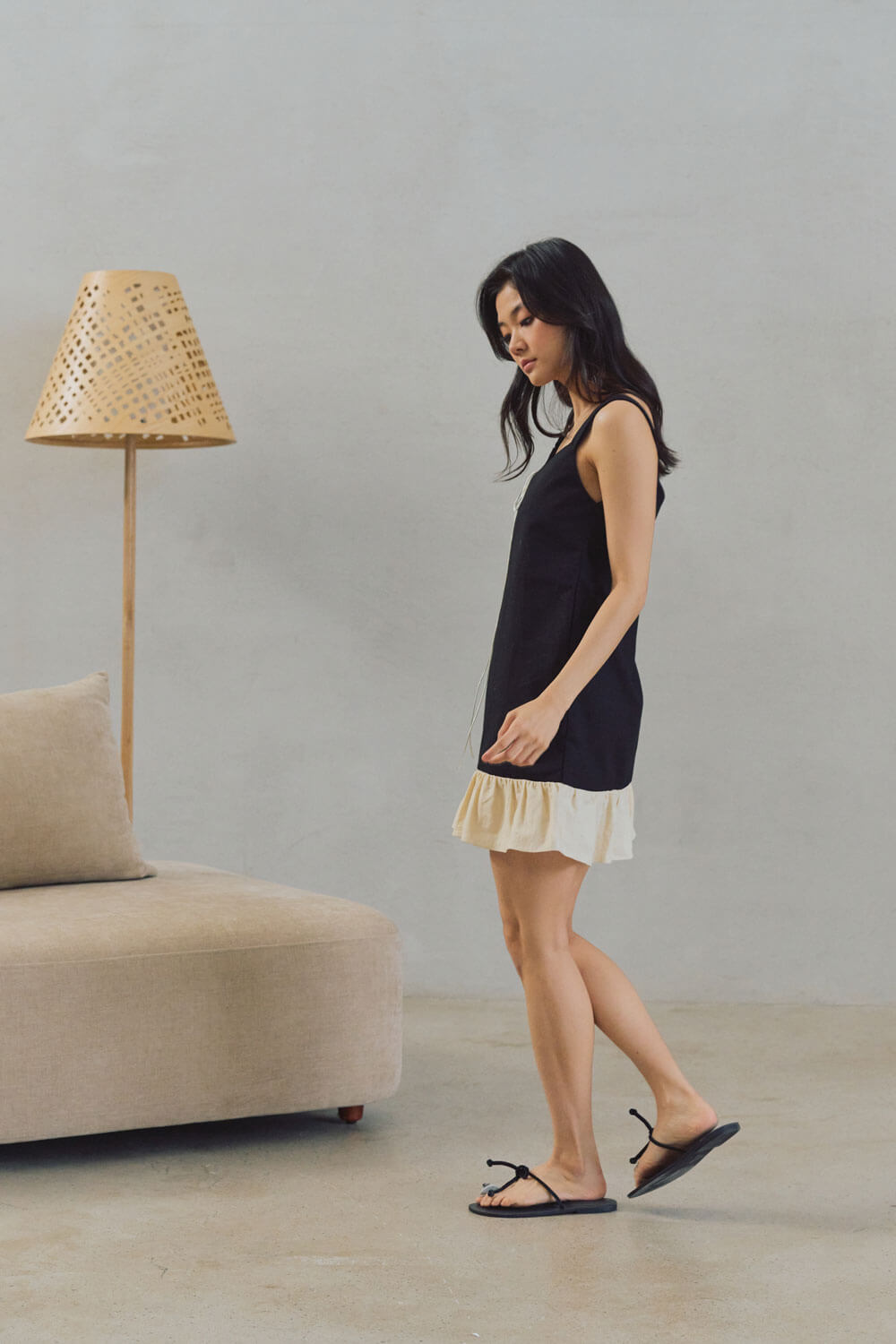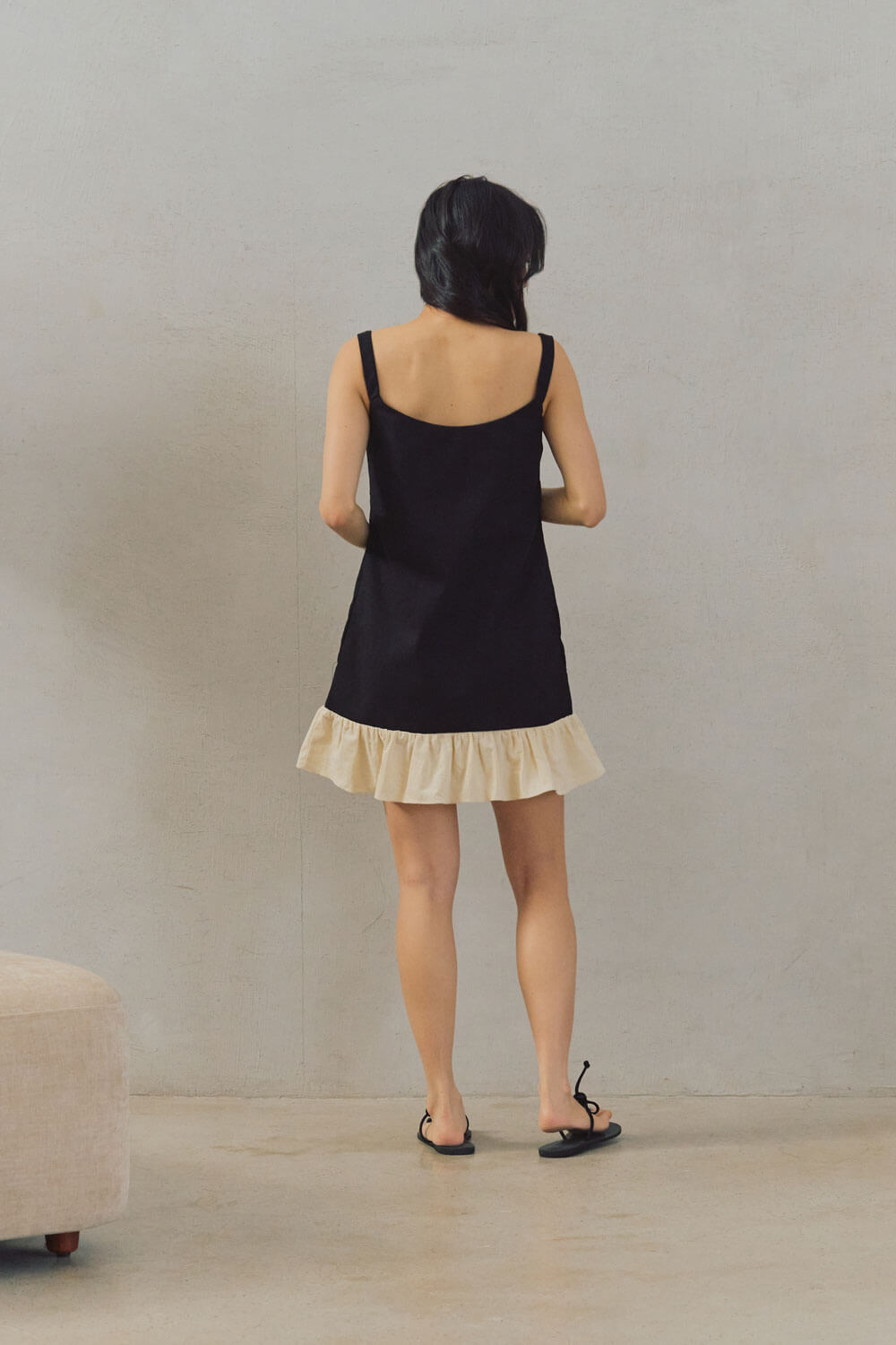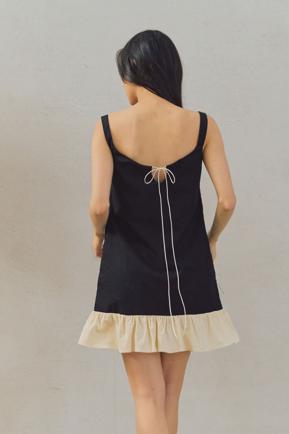 Designed with a loose fit. Mini dress length with pockets and keyhole detail on neckline. Neckline is reversible (either side can be worn in front). Wear the keyhole detail and ribbon tie in the front or back. Tie ribbon straps into a bow or leave untied.