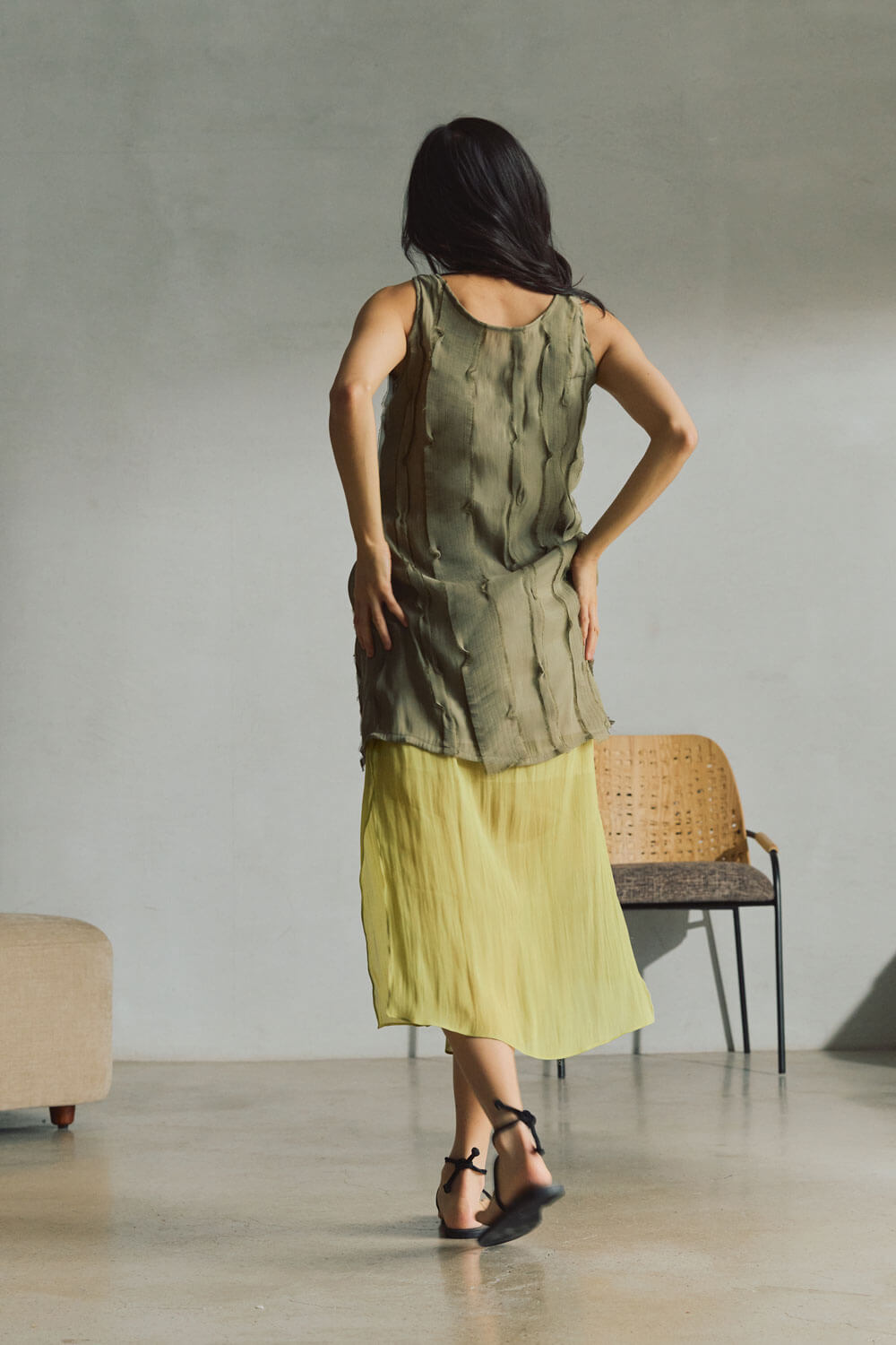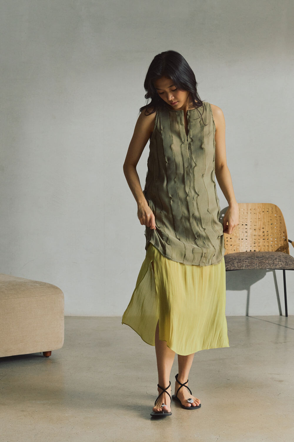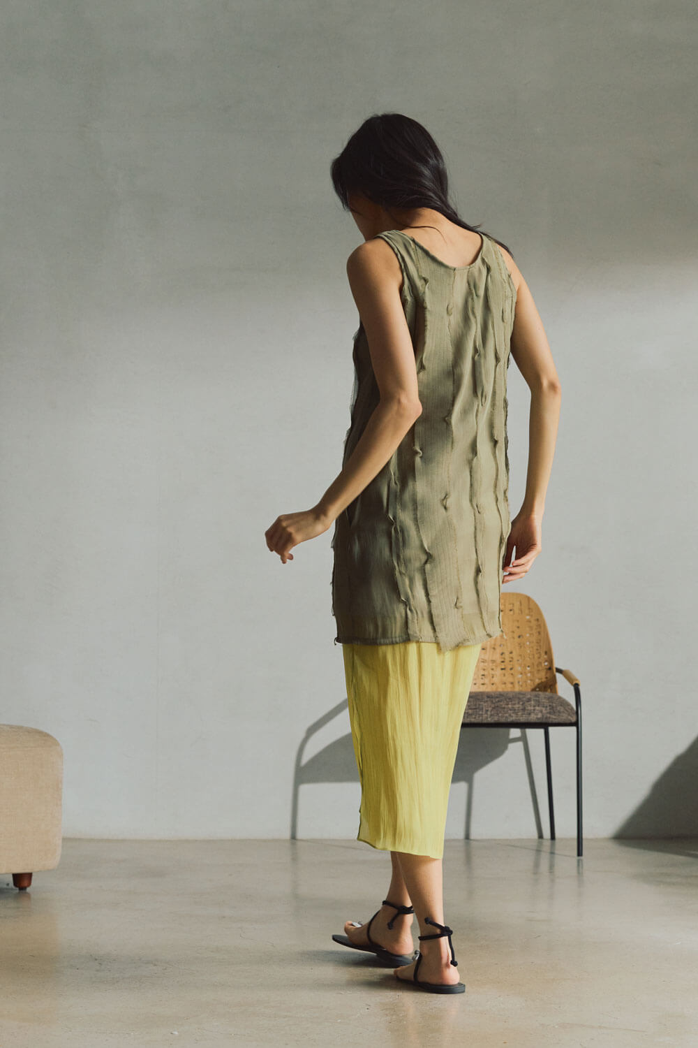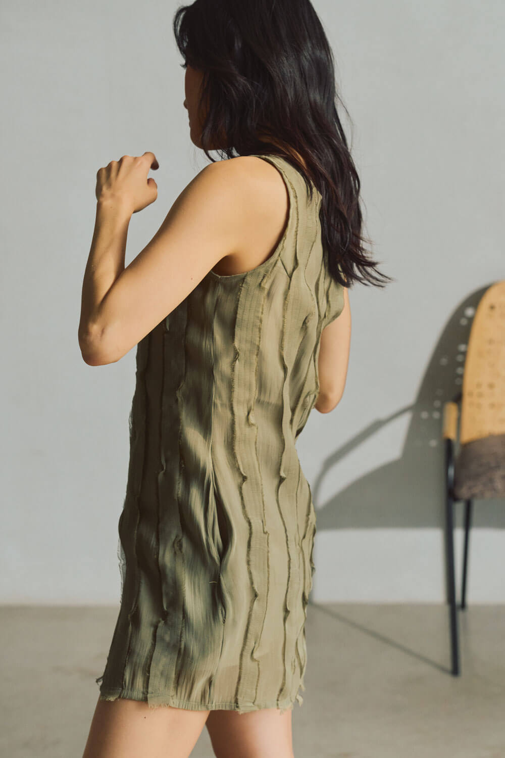 True to size. Round neck, sleeveless, mini length dress with pockets. Neckline is reversible (either side can be worn in front). Wear the zipper detail in the front or back. Each strip of fabric is hand cut and sewn onto the dress to create texture—fabric manipulation made to mimic sand on low tide.