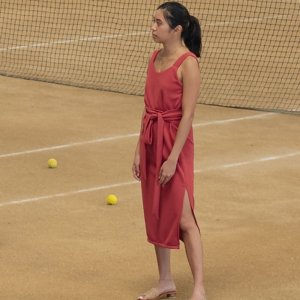 True to size; shift silhouette. Easy shift dress with built in belts (designed long so you can tie around waist as you please)–from back to front/ front to back; or just bow in front or bow at the back.