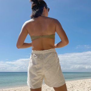 True to size. High waist shorts w/ garterized waist & drawstring feature. Functional fringe pockets.