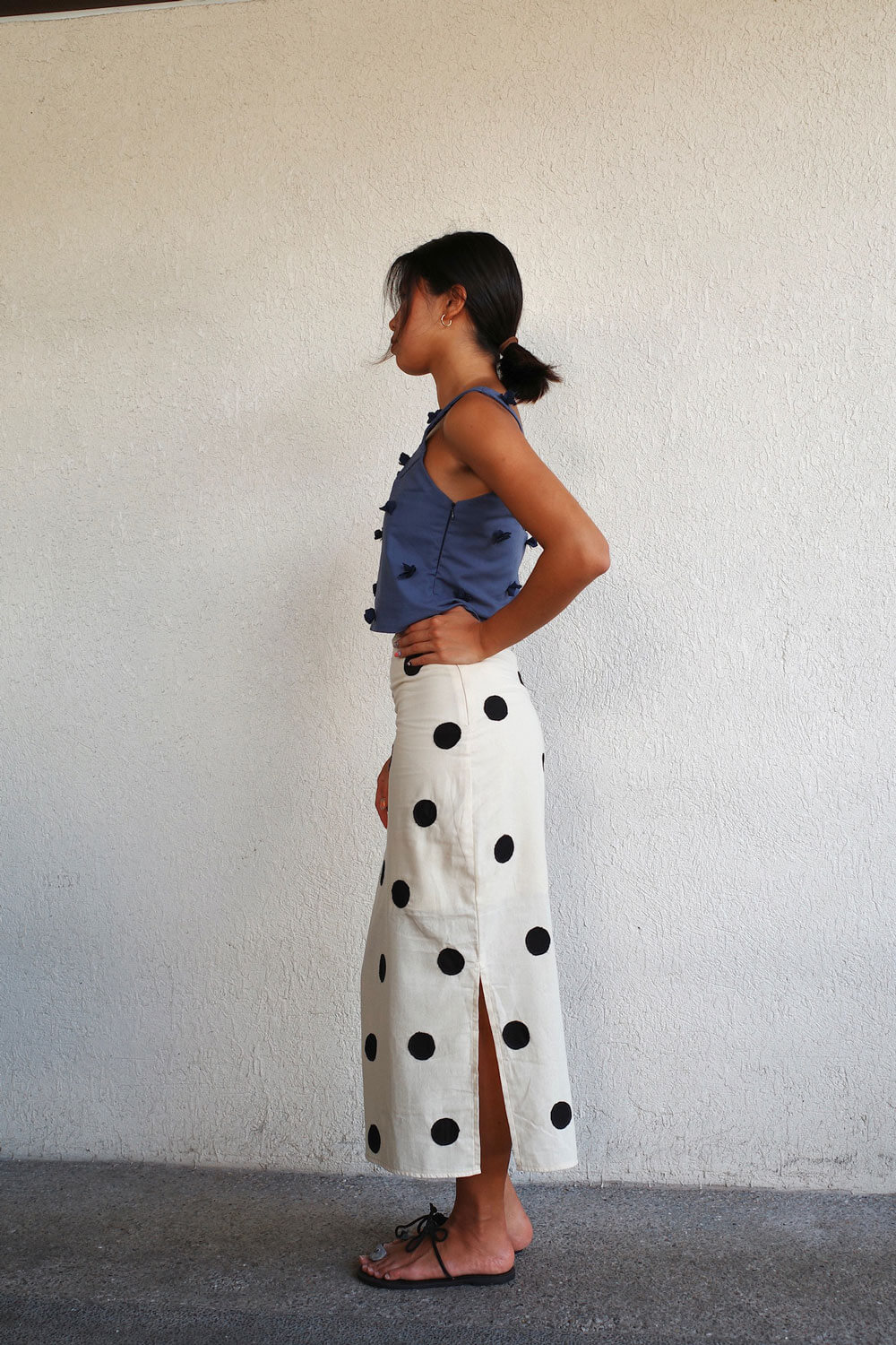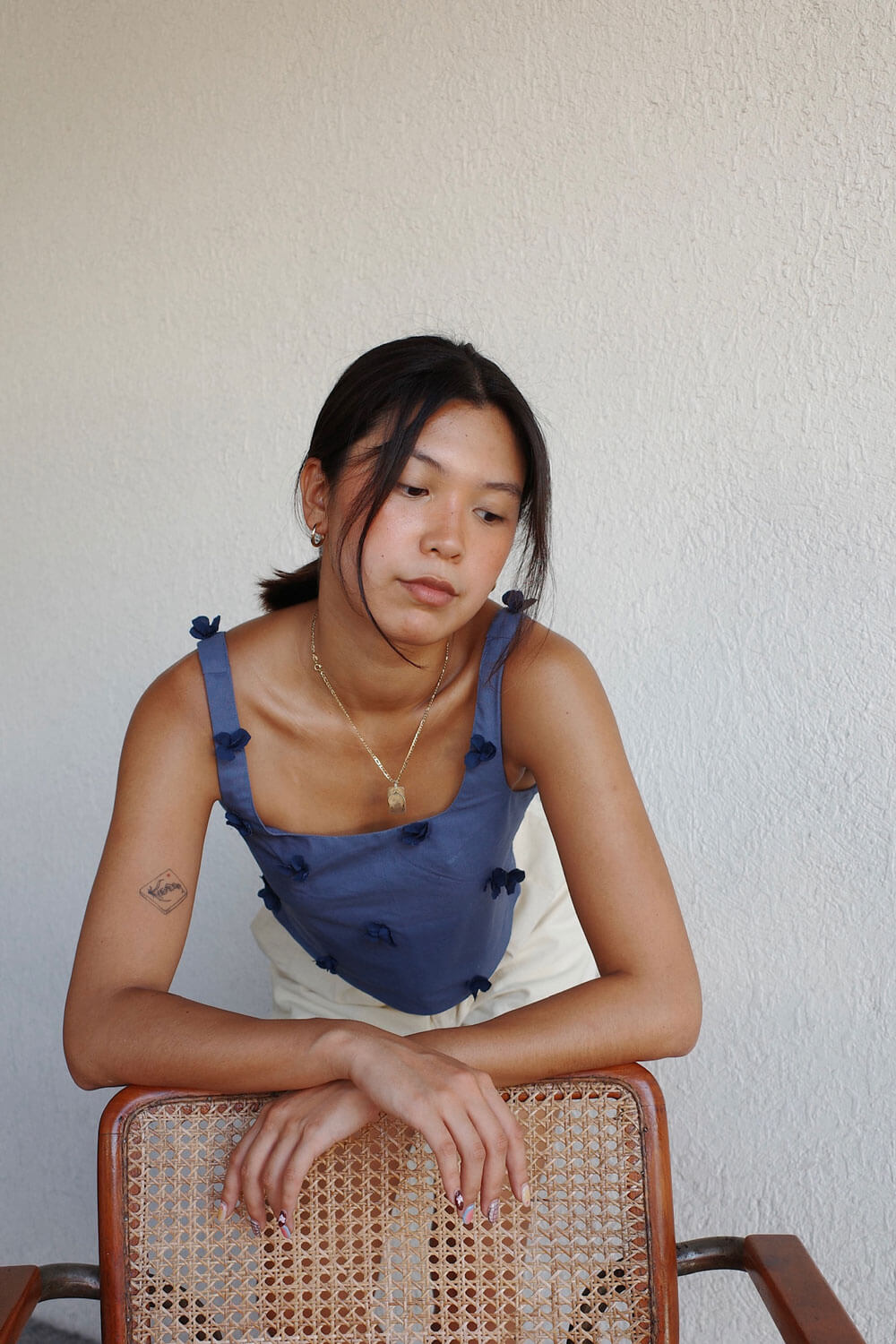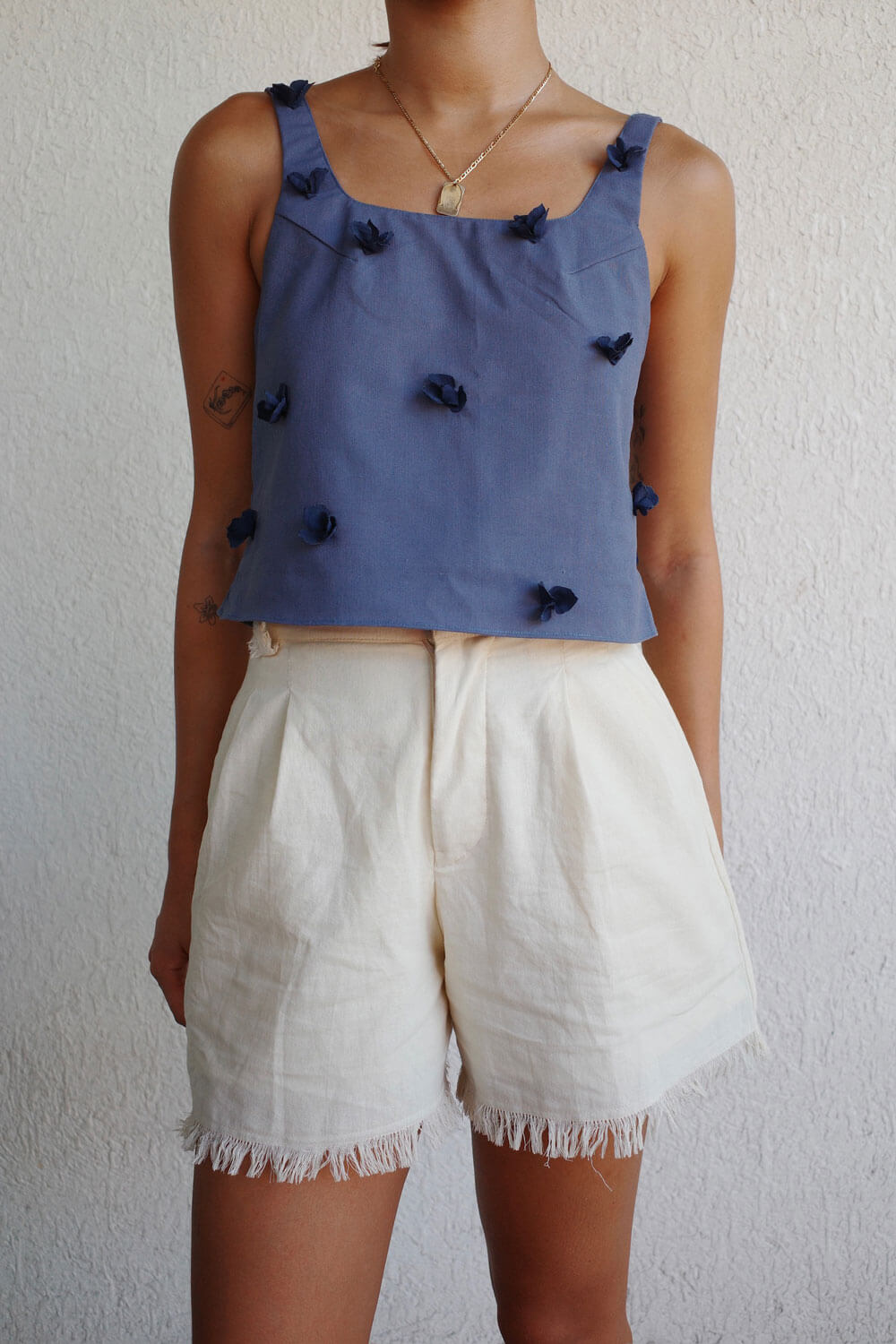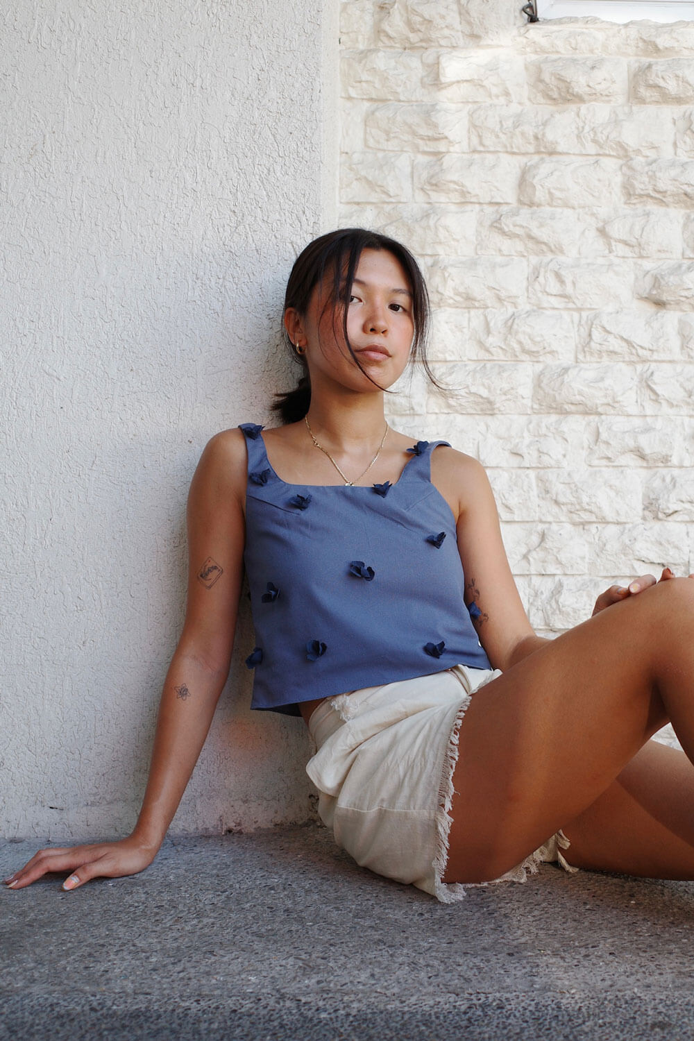 True to size. Cropped length with soft-squared neckline and handcut / handsewn crepe florals.