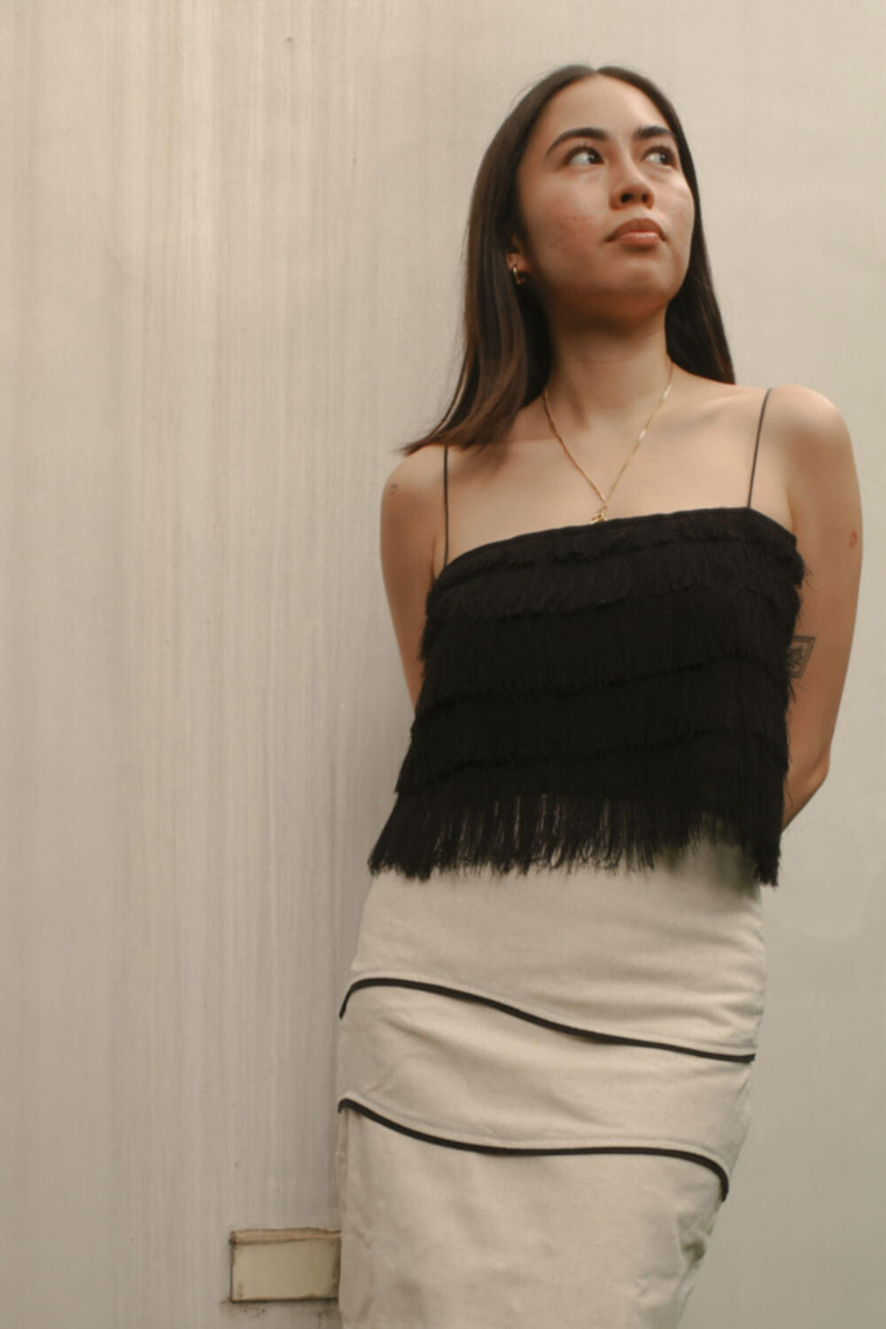 True to size. Individually handmade multi-layer fringe top. One top takes days to finish. Side zipper opening. To care for the handmade fringes, use a finetooth comb to brush the fringes.
