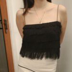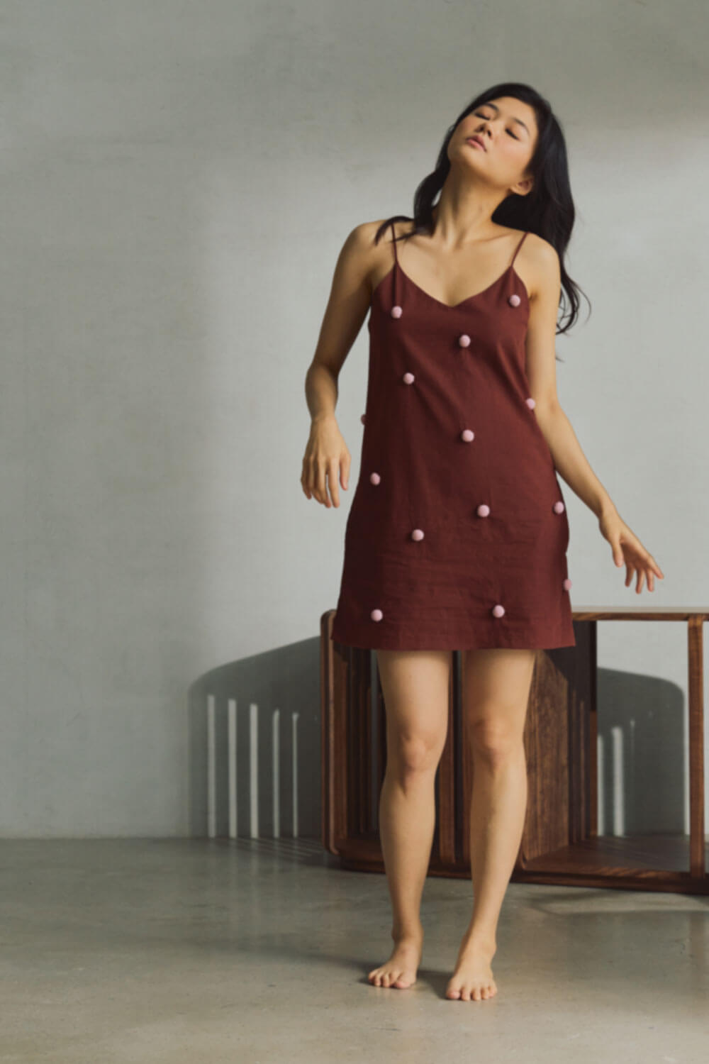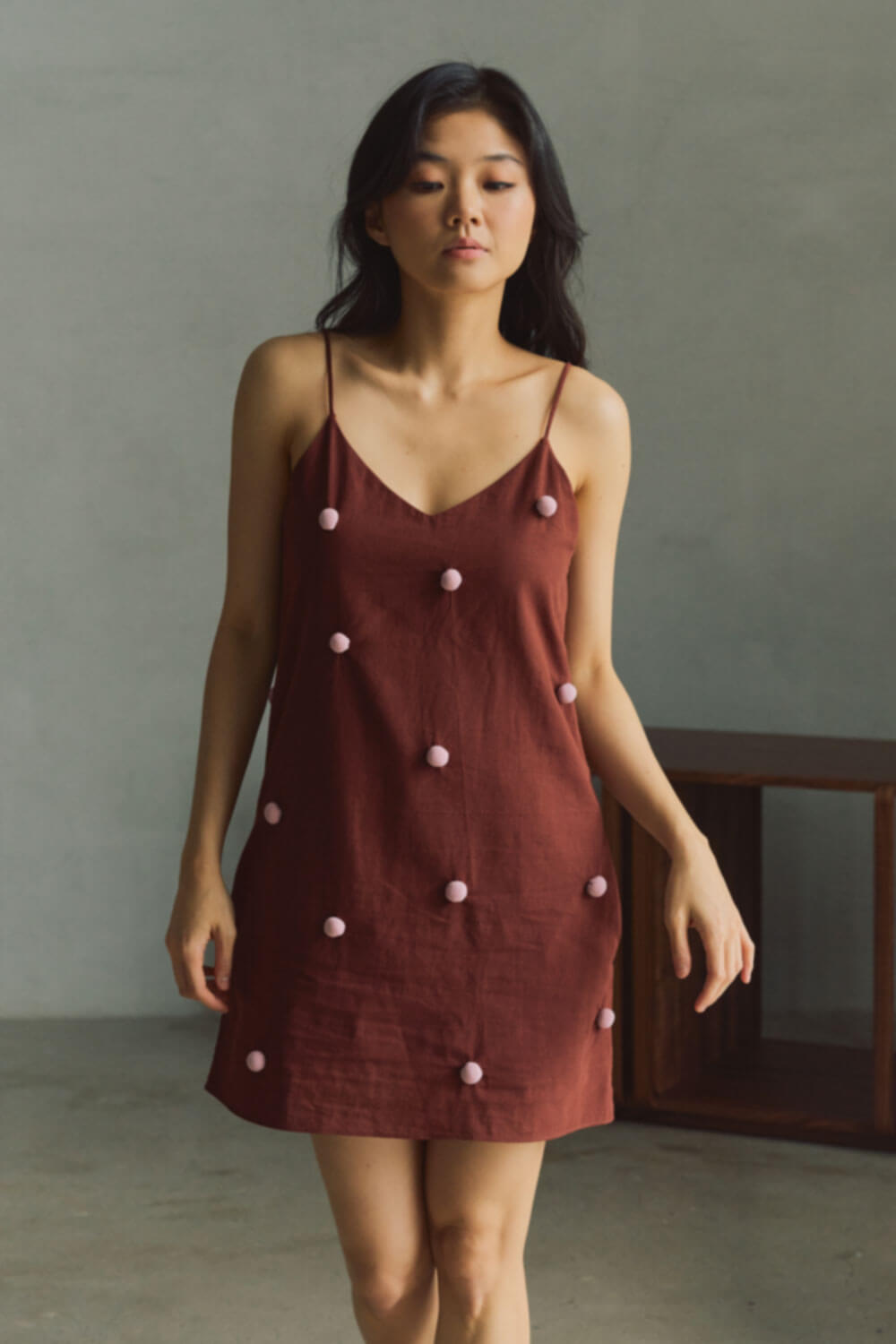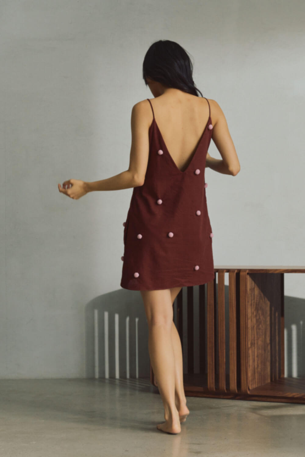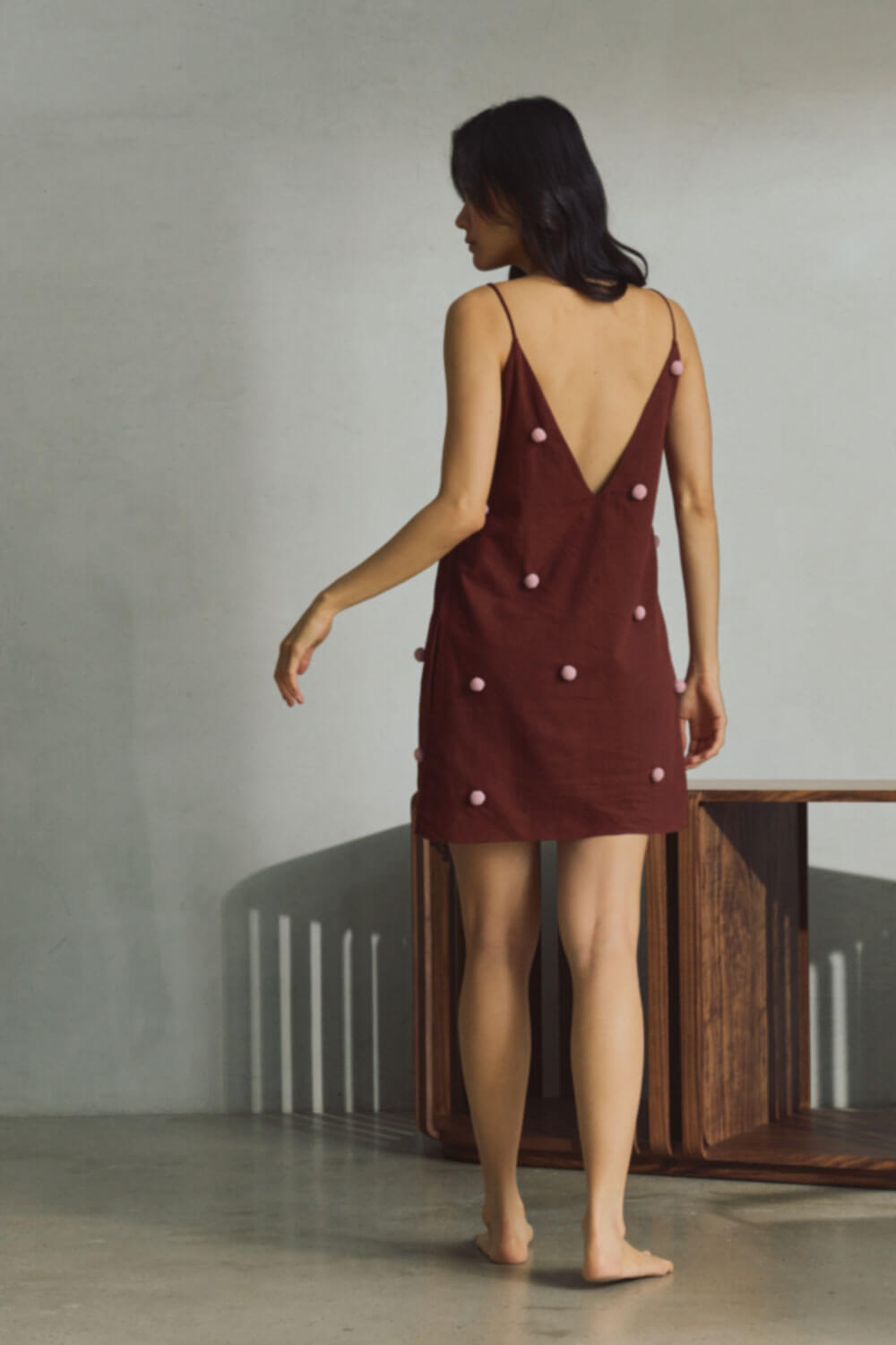 Designed with a loose fit. V-neck, spaghetti strap mini dress with a deep-V back neckline and pockets. The “bola-bola” detail adds texture—each ball is stuffed with scrap fabric and end cuts for dimension.
