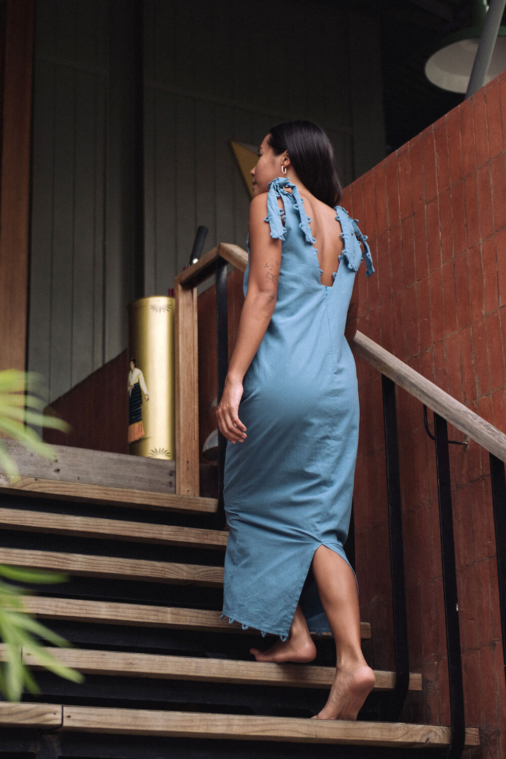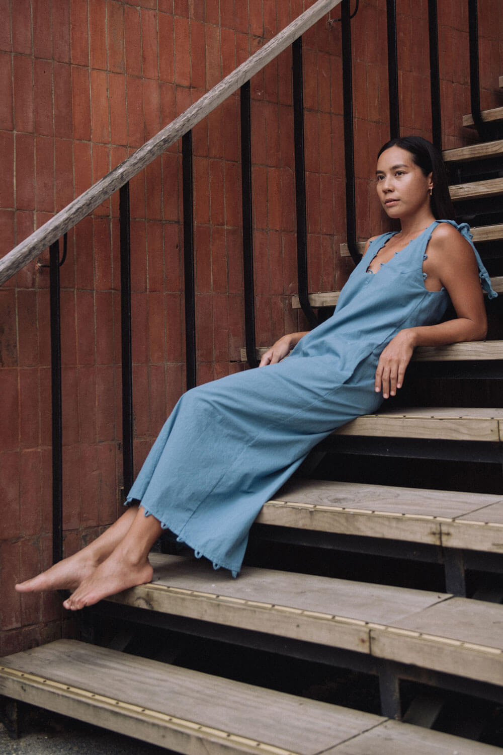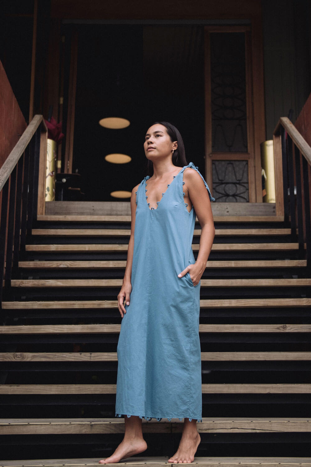 True to size. Shift silhouette midi dress with center back slit & side pockets. Shoulder ribbon ties must be double tied to secure. Handsewn scallop loop details in neckline & hem.