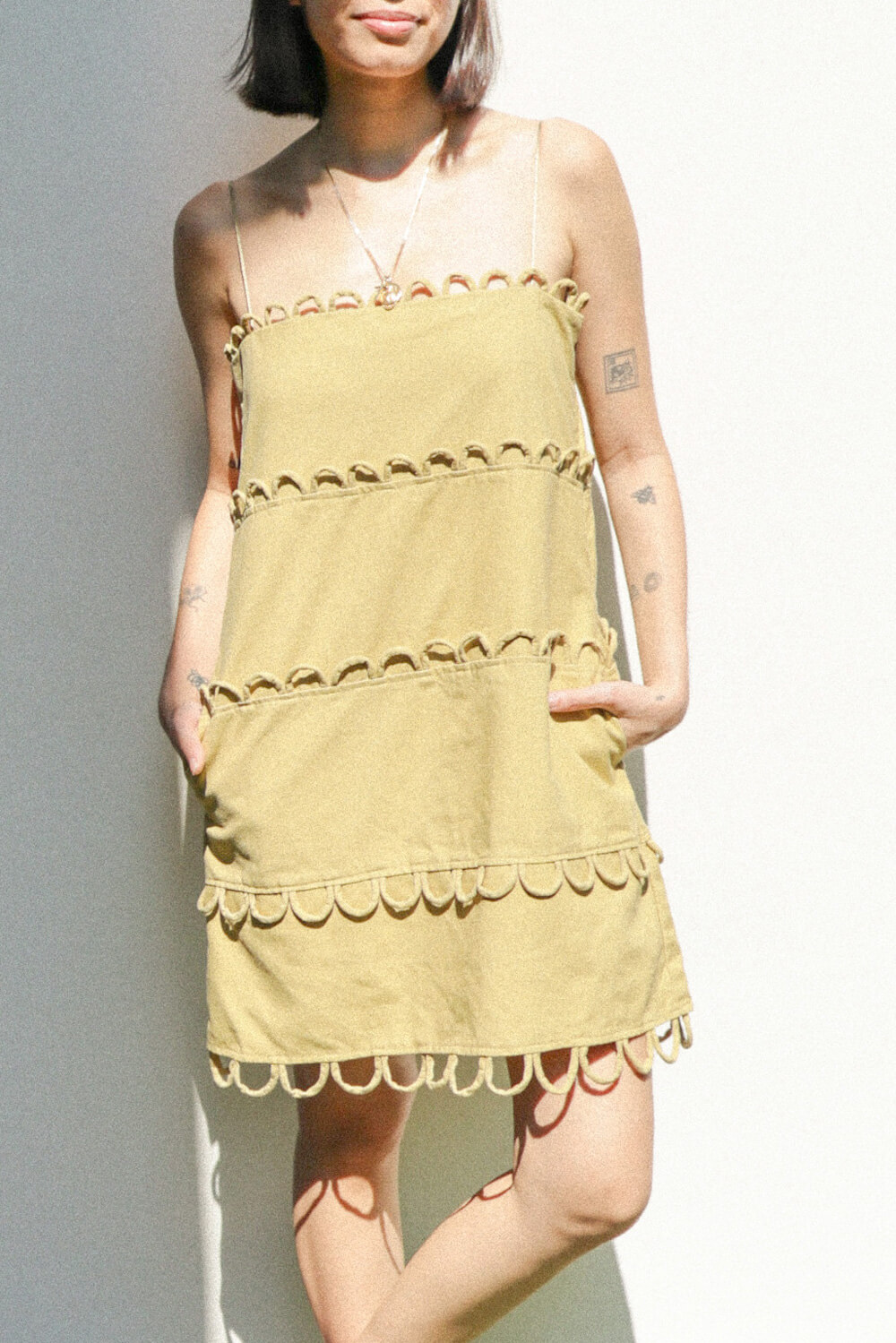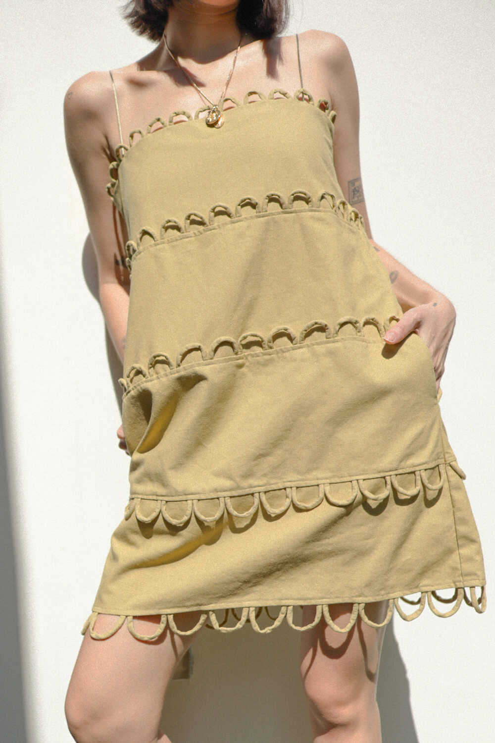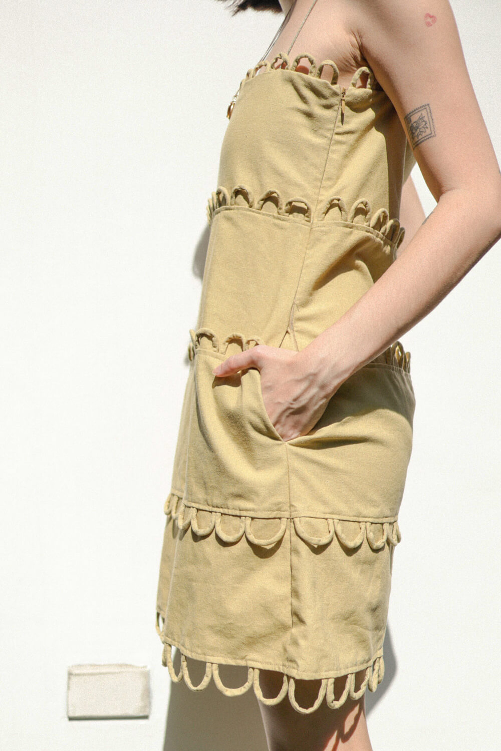 True to size. 2-way style: w/ straps or tube (tucked in straps). Boxy fit mini dress w/ pockets. Invisible side zipper closure. Handsewn scallop details that gradually increase in size from bust to hem.