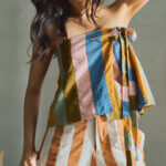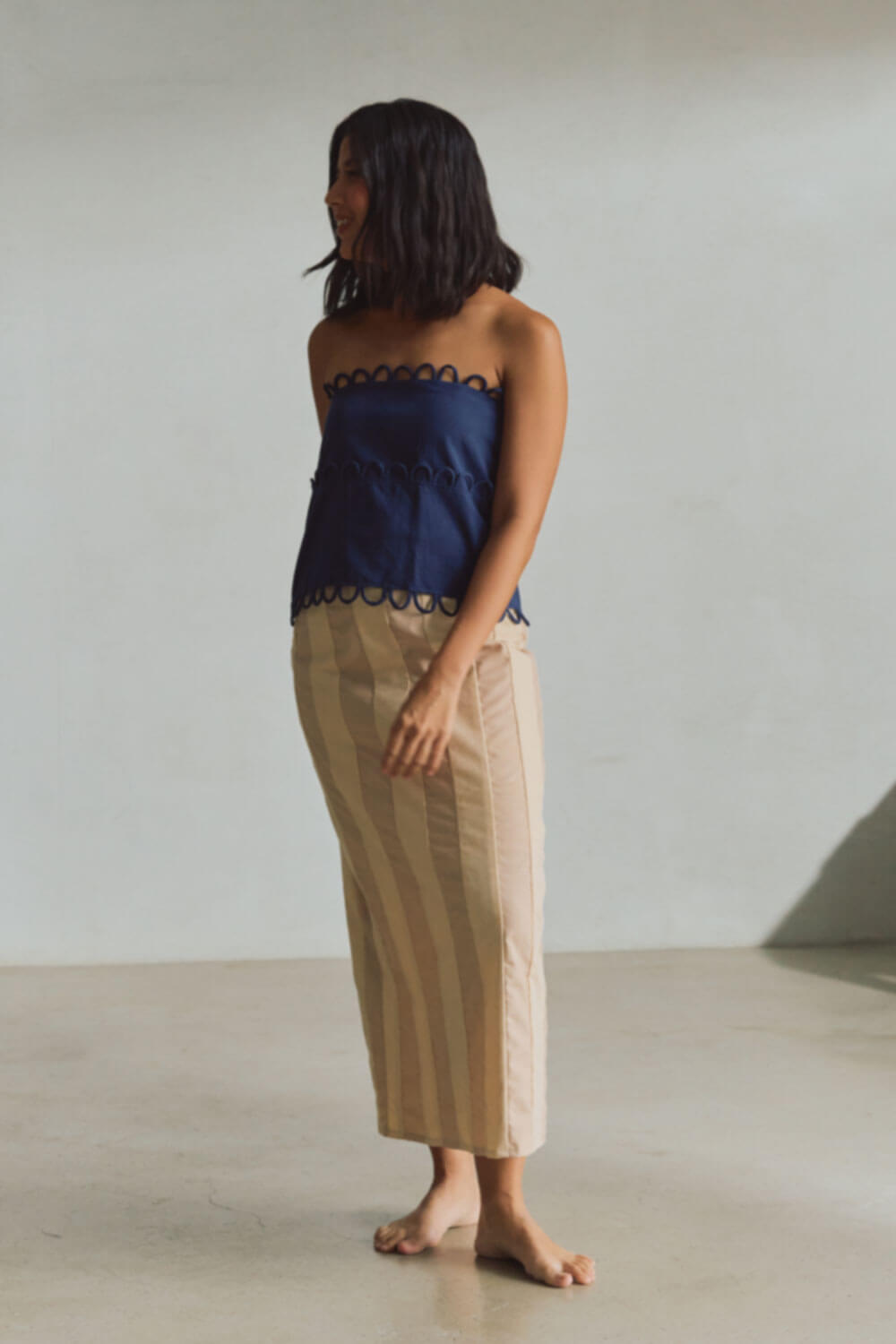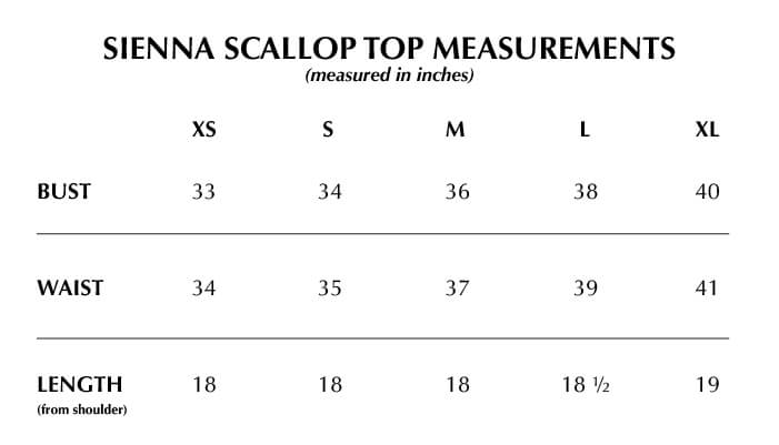 True to size. 2-way style: w/ straps or tube top (tucked in straps). Boxy fit. Invisible side zipper closure. Handsewn scallop details.