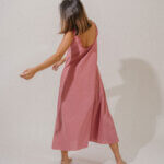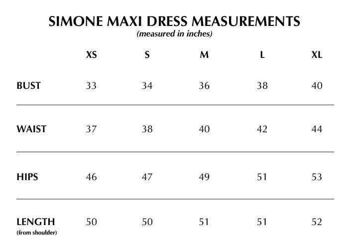 True to size in bust area. Semi A-line silhouette maxi length dress with pockets. Either neckline can be worn front or back.