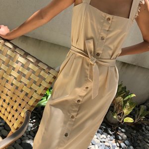 True to size; Relaxed fit, above-the-knee sheath dress with removable belt and pockets. Button-down detail can be worn front or back. *NOTE: Finger comb or iron flat the fringe detail after wash.